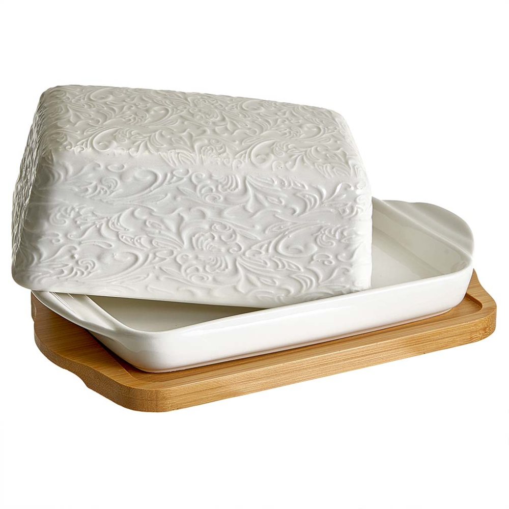 - Масленка фарфоровая с фарфоровой крышкой на бамбуковой подставке