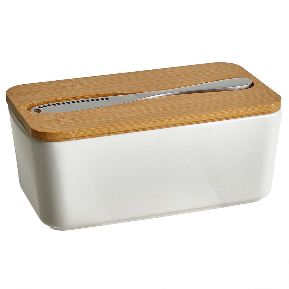 - Масленка фарфоровая с бамбуковой крышкой и ножом для масла из нержавеющей стали