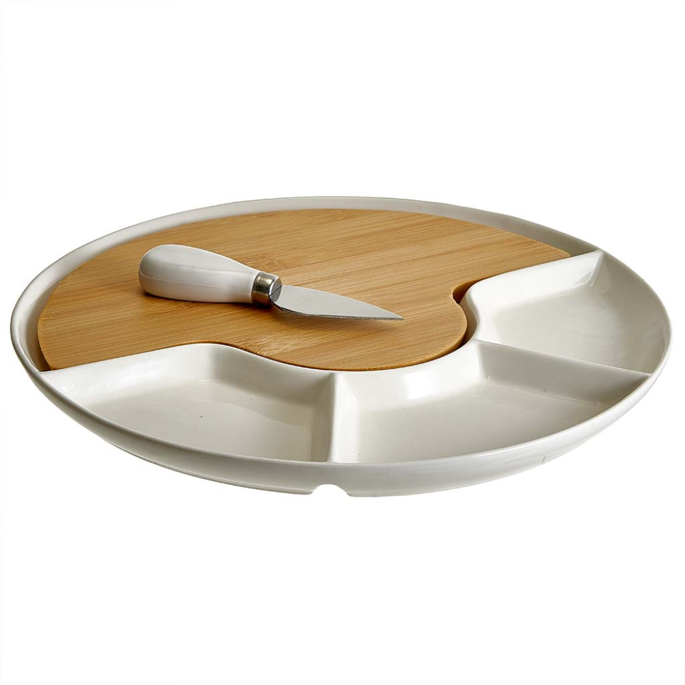 - Набор для подачи сыра: фарфоровая менажница, бамбуковая фигурная доска, нож для твердых сыров из нержавеющей стали с фарфоровой рукояткой