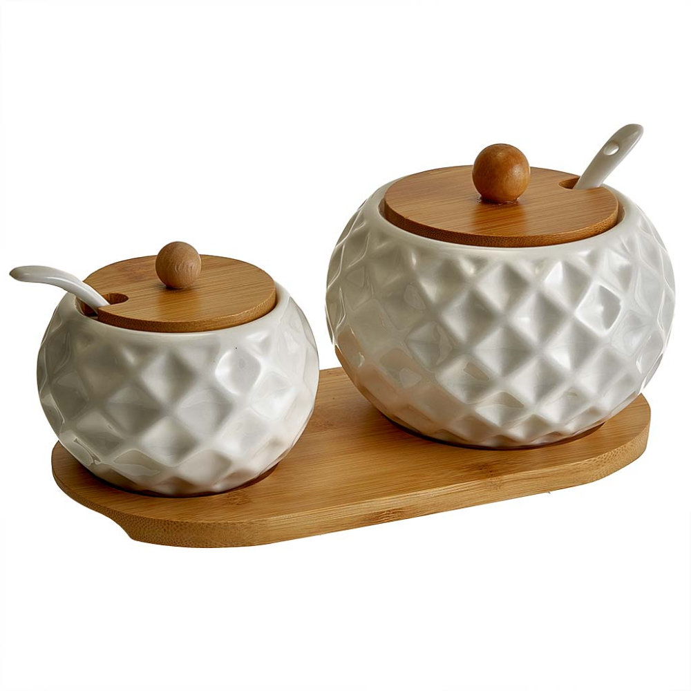 - Набор из 2 фарфоровых банок (250 мл и 450 мл) с 2 бамбуковыми крышками и с 2 фарфоровыми ложками на бамбуковой подставке