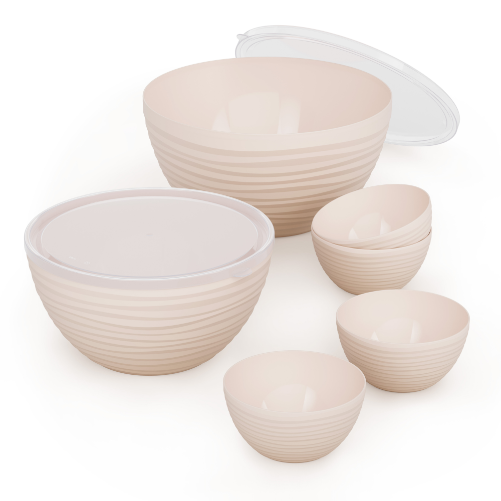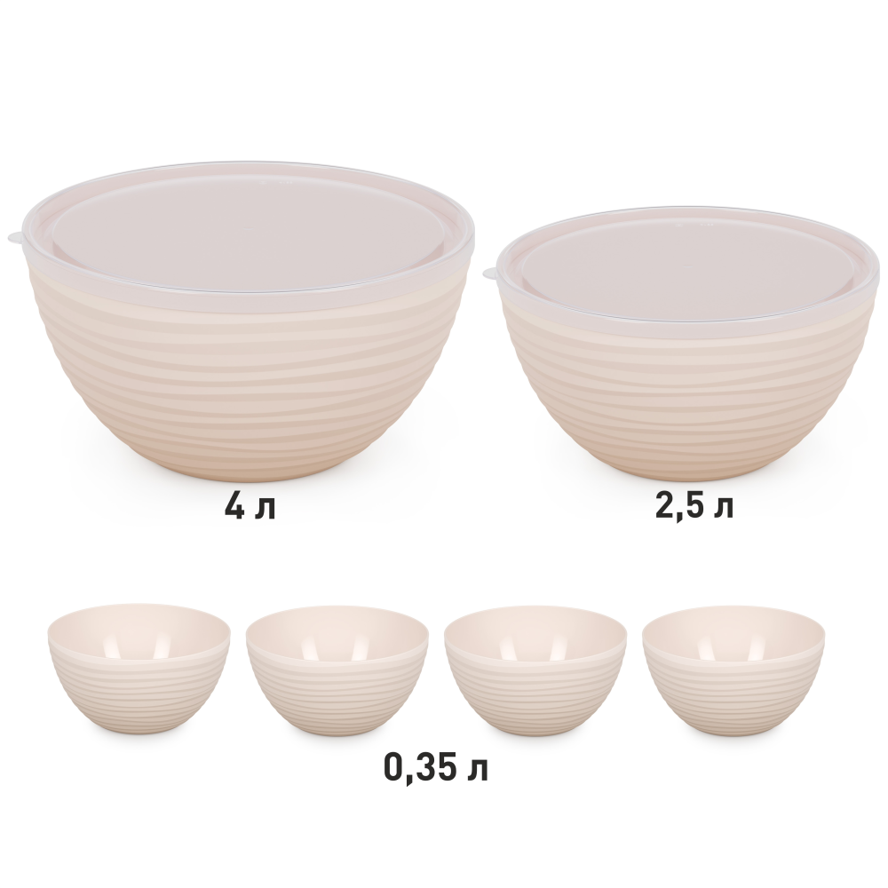Данный набор состоит из 6 чаш: одна большая чаша с крышкой — 4л, одна средняя чаша с крышкой — 2,5л и четыре маленькие чаши объемом — 350мл.