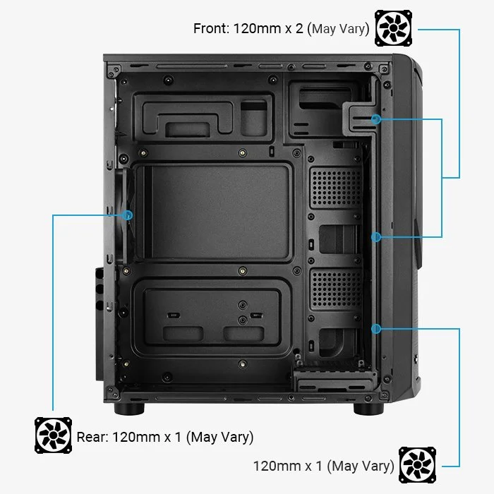 Для максимально эффективного охлаждения компонентов поддерживается установка вентиляторов на передней и задней панелях корпуса.
