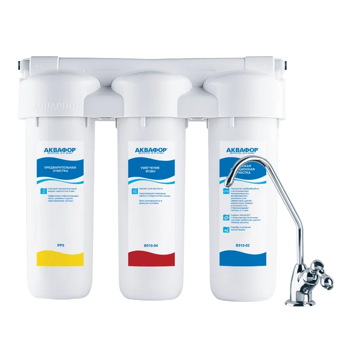 Благодаря особенностям структуры модулей фильтр удаляет ржавчину, примеси и активно борется с мутностью. Уникальный сорбент Аквален надежно устраняет активный хлор, тяжелые металлы и другие опасные вещества. Фильтр для воды Аквафор Трио Норма Умягчающий — экономичный вариант глубокой очистки воды.