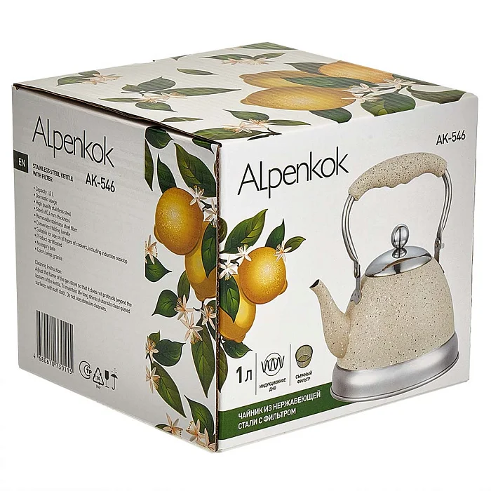 Чайник 1 л из нержавеющей стали с фильтром из нержавеющей стали, индукционное дно ALPENKOK AK-546 бежевый гранит