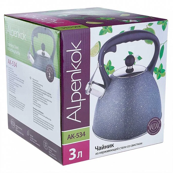 Чайник со свистком 3 л ALPENKOK AK-534 серый гранит, ручка черная