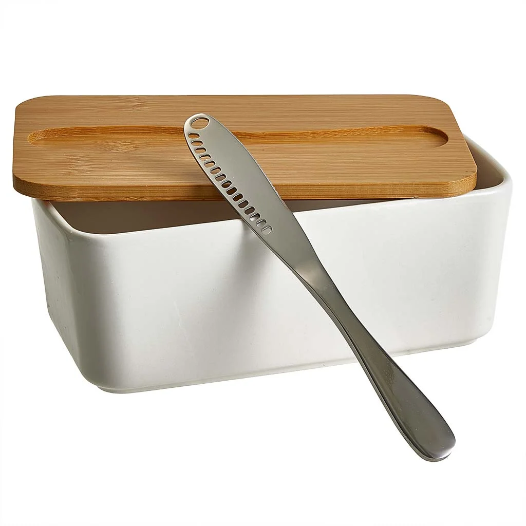- Масленка фарфоровая с бамбуковой крышкой и ножом для масла из нержавеющей стали