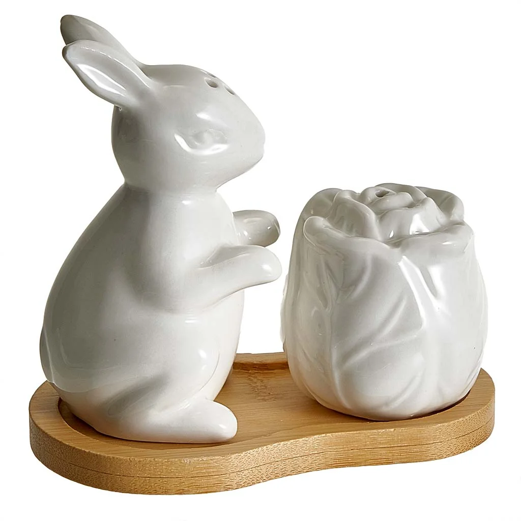 - Набор для специй (фарфоровая солонка фигурная, фарфоровая перечница фигурная) на бамбуковой подставке