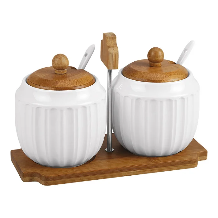 - Набор фарфоровых банок с бамбуковыми крышками и фарфоровыми ложками на бамбуковой подставке