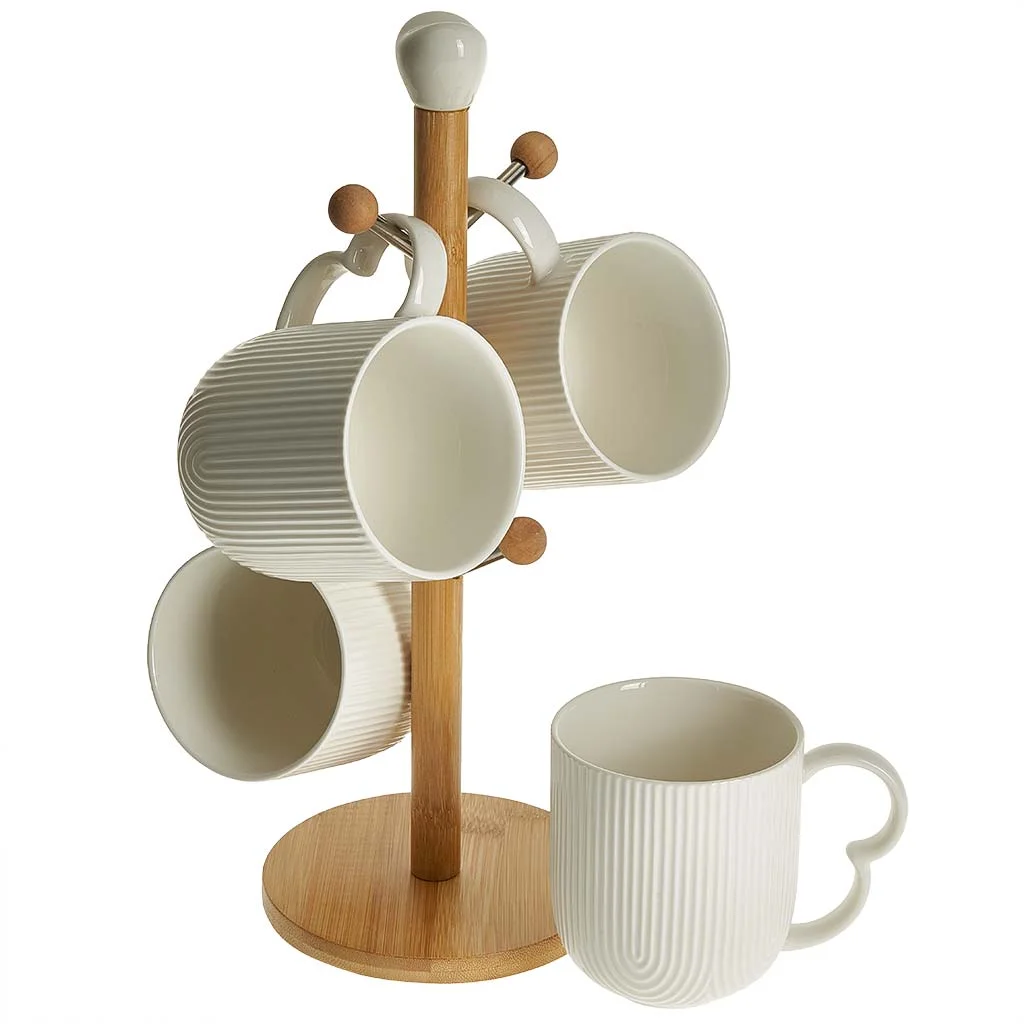 - Набор фарфоровых кружек на бамбуковой подставке