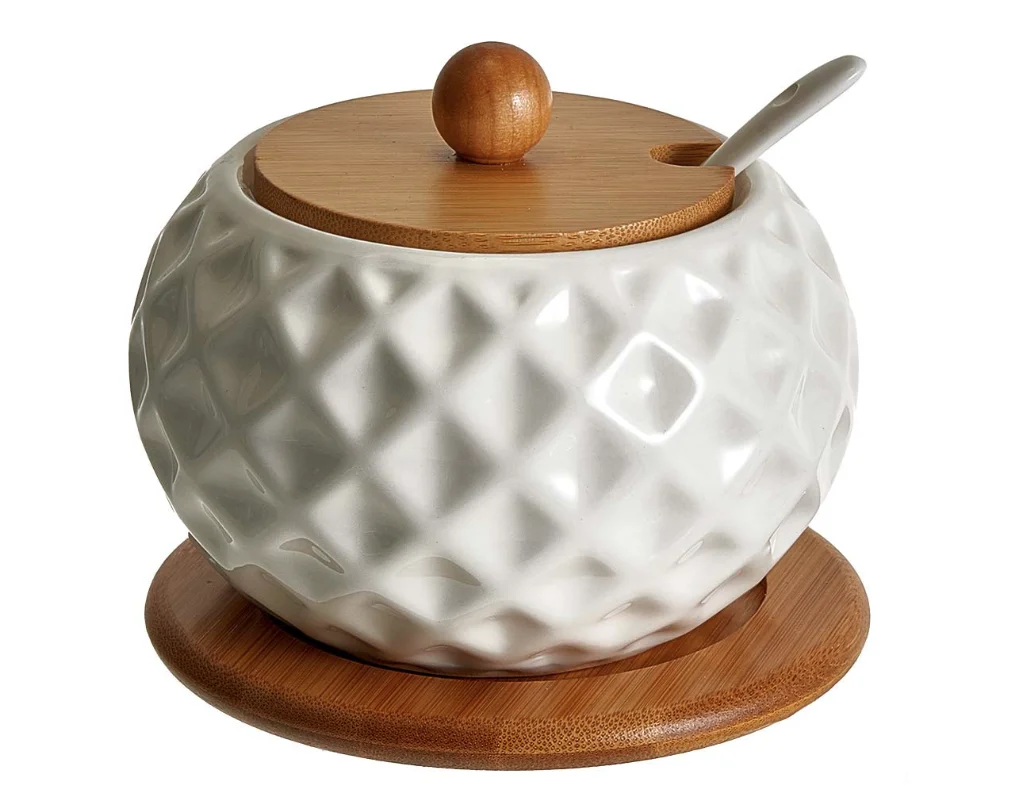 - Сахарница фарфоровая (450 мл) с бамбуковой крышкой и с фарфоровой ложкой на бамбуковой подставке