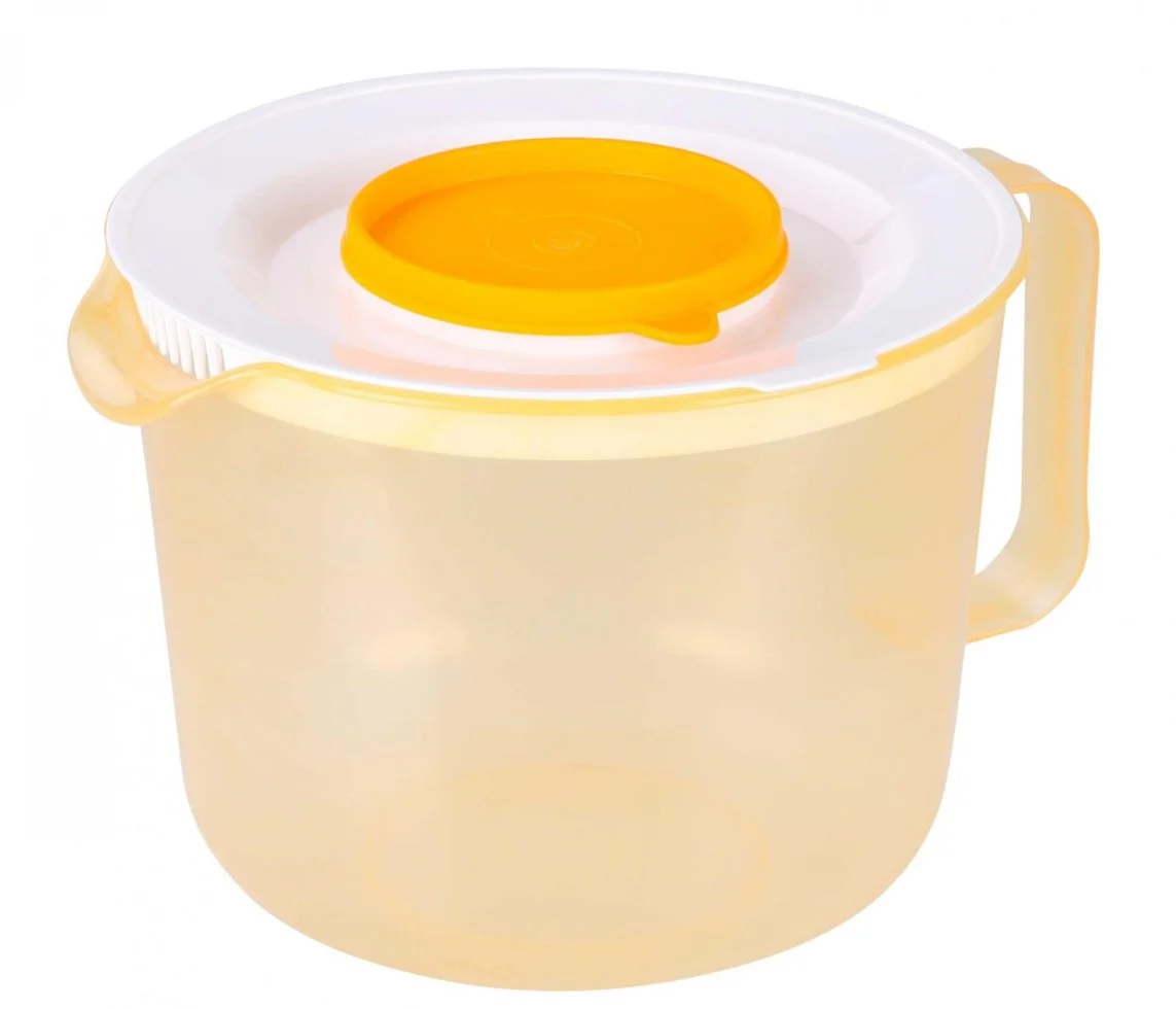 Перед Вами идеальный помощник на любой кухне. Ёмкость предназначена для приготовления теста, кремов, коктейлей, фруктово-ягодных муссов и других блюд. Взбивание продуктов можно осуществлять как миксером, так и блендером. Процесс приготовления становится комфортным благодаря специальной крышке, защищающей от разбрызгивания. В ёмкости легко хранить уже готовые коктейли, достаточно лишь закрыть отверстие дополнительной мягкой крышкой, защищающей продукты от заветривания. Эта центральная крышка, надетая во время работы миксера на дно, дарит ёмкости противоскользящий эффект. Для удобного слива содержимого на ёмкости имеется эргономичная ручка и носик. Мерная шкала даёт возможность использования изделия и в качестве мерного стакана.