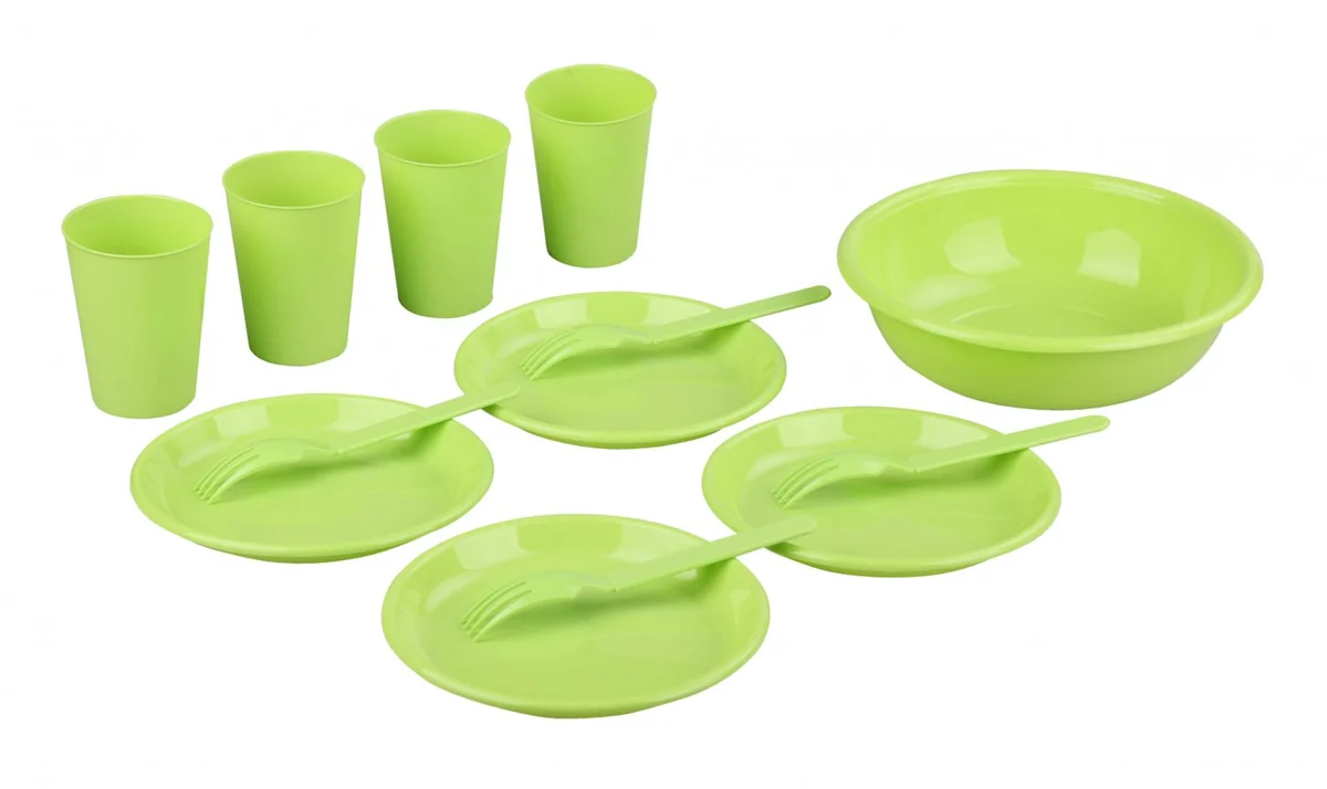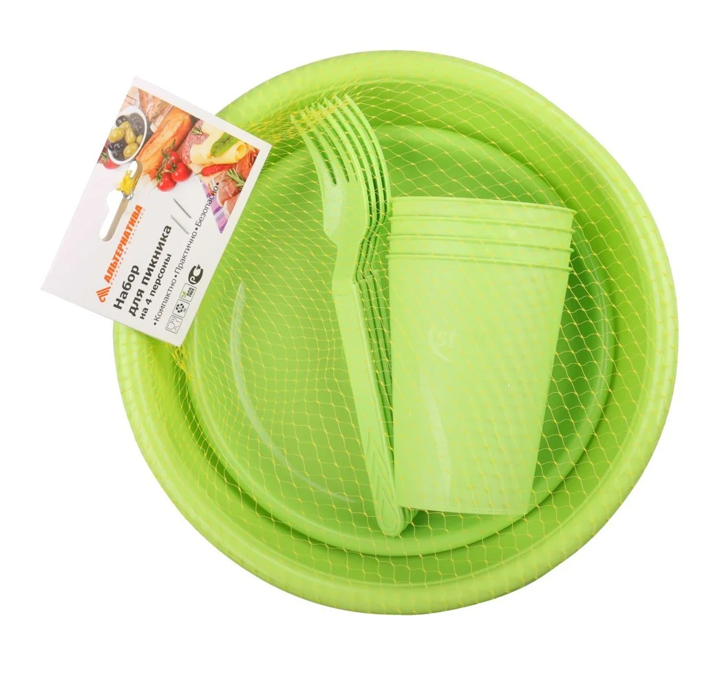 Набор для пикника 4 персоны выполнен из безопасного пищевого пластика. В комплект входит 4 стакана, тарелки, приборы и салатник.