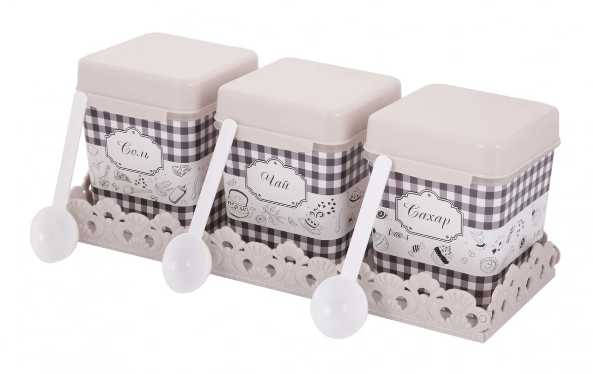 Набор емкостей на полке решает проблему рационального размещения самых необходимых продуктов. Тематическая надпись на емкостях говорит о том, что нужно хранить внутри: чай, сахар, соль. Яркий рисунок нанесен на изделия при помощи технологии IML. Он не стирается и не повреждается в процессе эксплуатации. Декор дарит особый колорит изделию и создает определенную стилистику кухни. В комплект каждой емкости входит мерная ложка для удобства использования. Изделие изготовлено из качественного пластика, безопасного для здоровья человека.