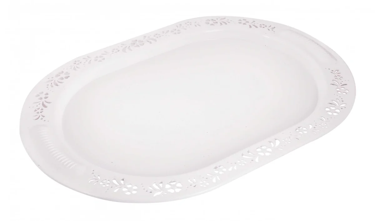 Поднос универсальный предназначен для переноски посуды. Изделие овальной формы изготовлено из высококачественного пластика. Поднос украшен изящной резной кромкой и оснащен удобными ручками. Вместительный и функциональный поднос станет незаменимым аксессуаром, как для сервировки, так и для декора кухни.