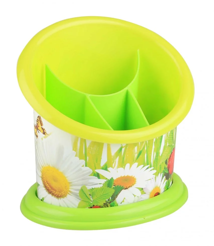 Удобная подставка предназначена для сушки и хранения столовых приборов и разных кухонных принадлежностей (половников, лопаток). Изделие обладает достаточной вместительностью и имеет четыре ячейки для раздельного хранения приборов. Поддон позволяет собирать стекающие капли. Яркий декор не повреждается в процессе эксплуатации изделия и делает подставку своеобразным украшением кухонного интерьера.