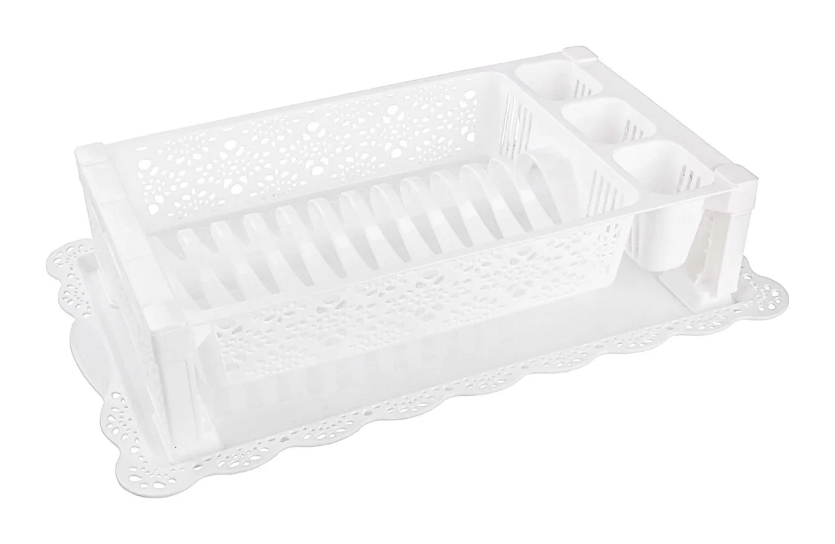Изделие предназначено для сушки посуды и столовых приборов. Сушилка разделена на несколько секций: решётка для тарелок различного размера и три глубоких отдела для ложек, вилок и ножей. Поддон позволяет собрать стекающие капли и защитить поверхность стола или полки от влаги. Благодаря своему внешнему виду, напоминающему кружево, такая сушилка обязательно впишется в интерьер любой кухни, добавив ей колорита.