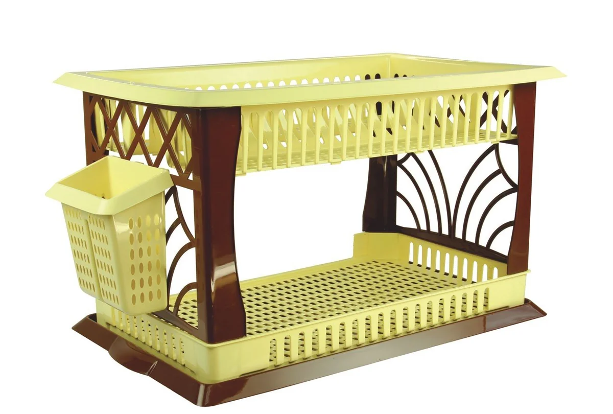 Изделие предназначено для сушки кухонной утвари. Верхний ярус позволяет размещать тарелки, а нижний ярус – чашки или другую глубокую посуду. На боковой стойке, соединяющей два яруса, располагается специальный карман для сушки столовых приборов. Поддон позволяет собрать стекающие капли и защитить поверхность стола от влаги.