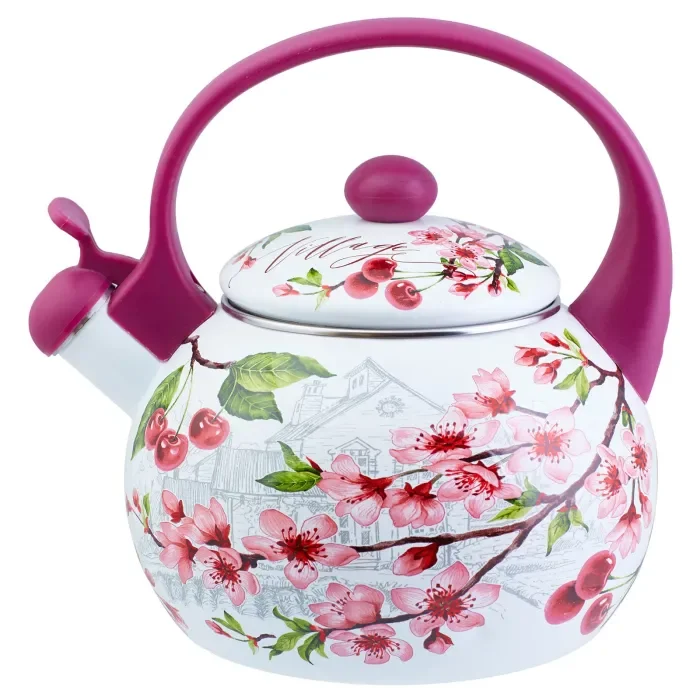 Эмалированный чайник объёмом 2 литра со свистком «Вишня» ТМ Appetite оснащён удобной эргономичной ручкой с клапаном, нажав на который, можно открыть заглушку на носике и налить воду.