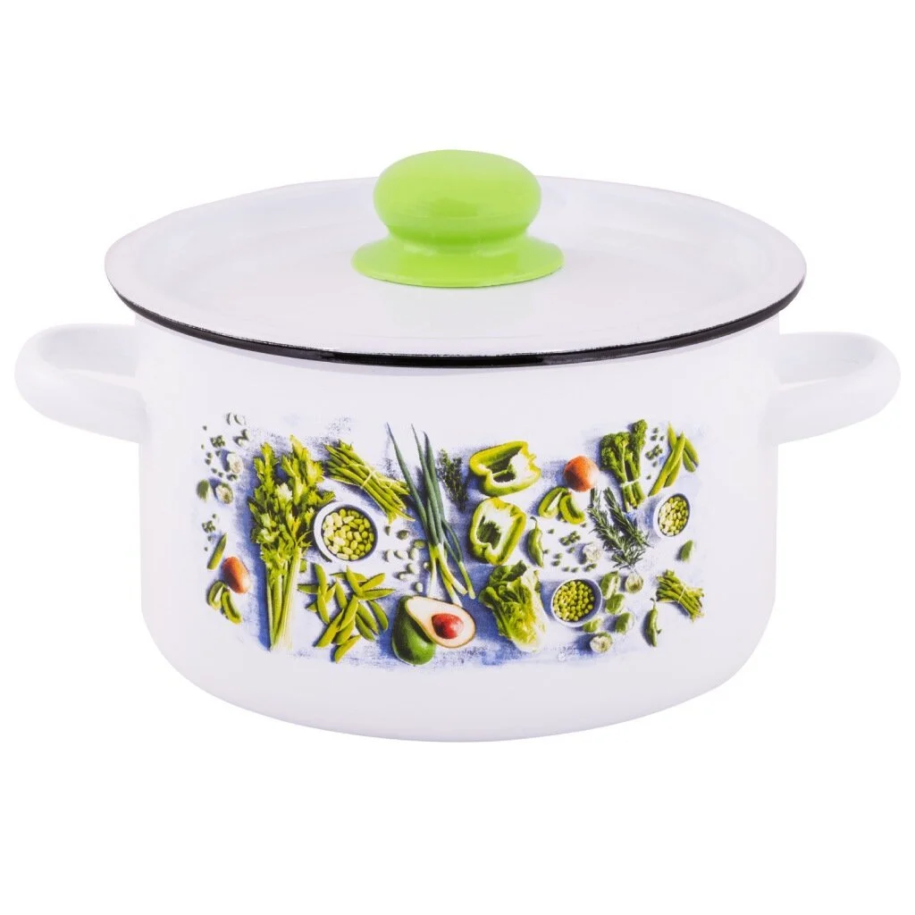 Цилиндрическая эмалированная кастрюля «Свежая зелень» объёмом 1,5 л ТМ Appetite предназначена для приготовления пищи, хранения пищевых продуктов, сервировки стола, санитарно-гигиенических и других хозяйственных нужд.