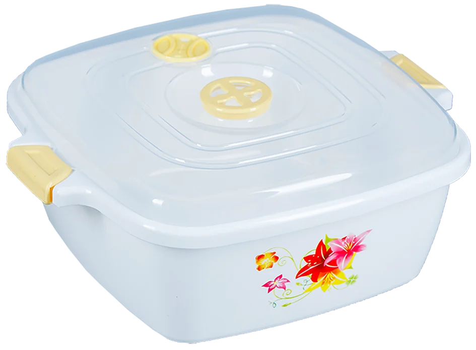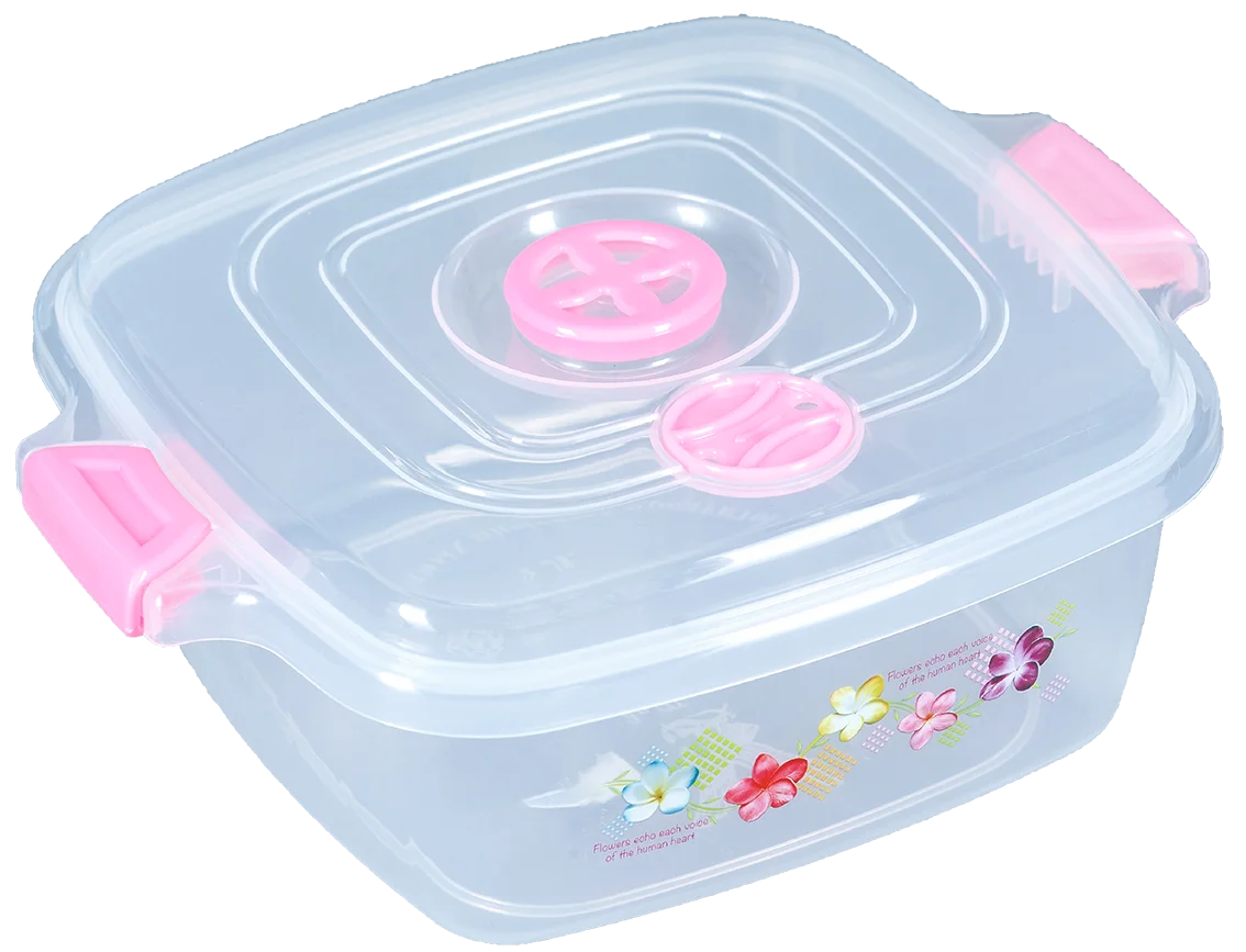Квадратный пищевой контейнер с крышкой. На крышке есть клапан для отвода воздуха, а прозрачность крышки позволит видеть, что внутри, не открывая контейнер.
