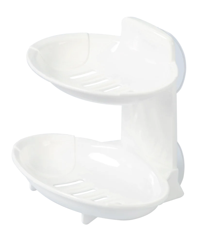 Двухъярусная мыльница с отверстиями, предотвращающими от скапливания воды и раскисания мыла. Изделие крепится на стену с помощью силиконовых присосок, которые входят в комплект.