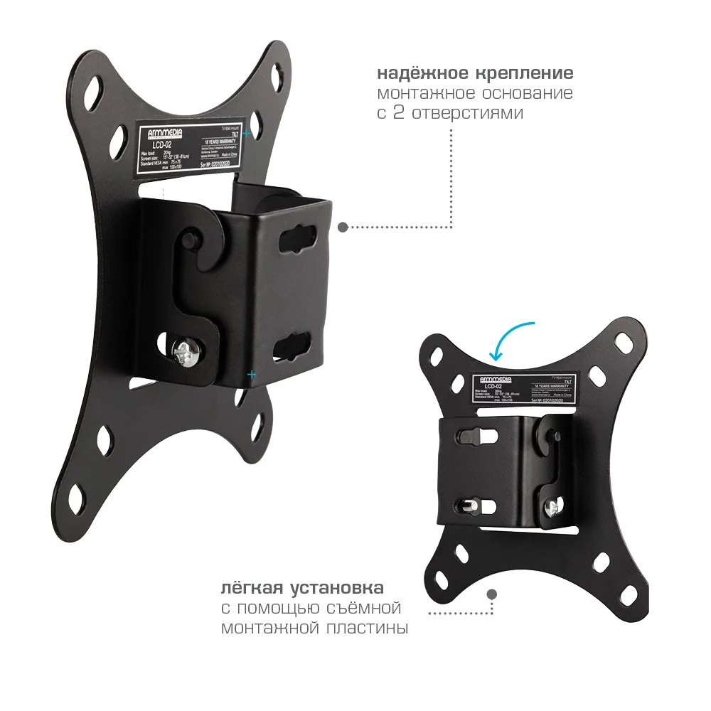 | Дополнительно: | Надежная стальная конструкция Легкий монтаж телевизора Благодаря наличию съемной монтажной пластины Функция - Антиблик |
