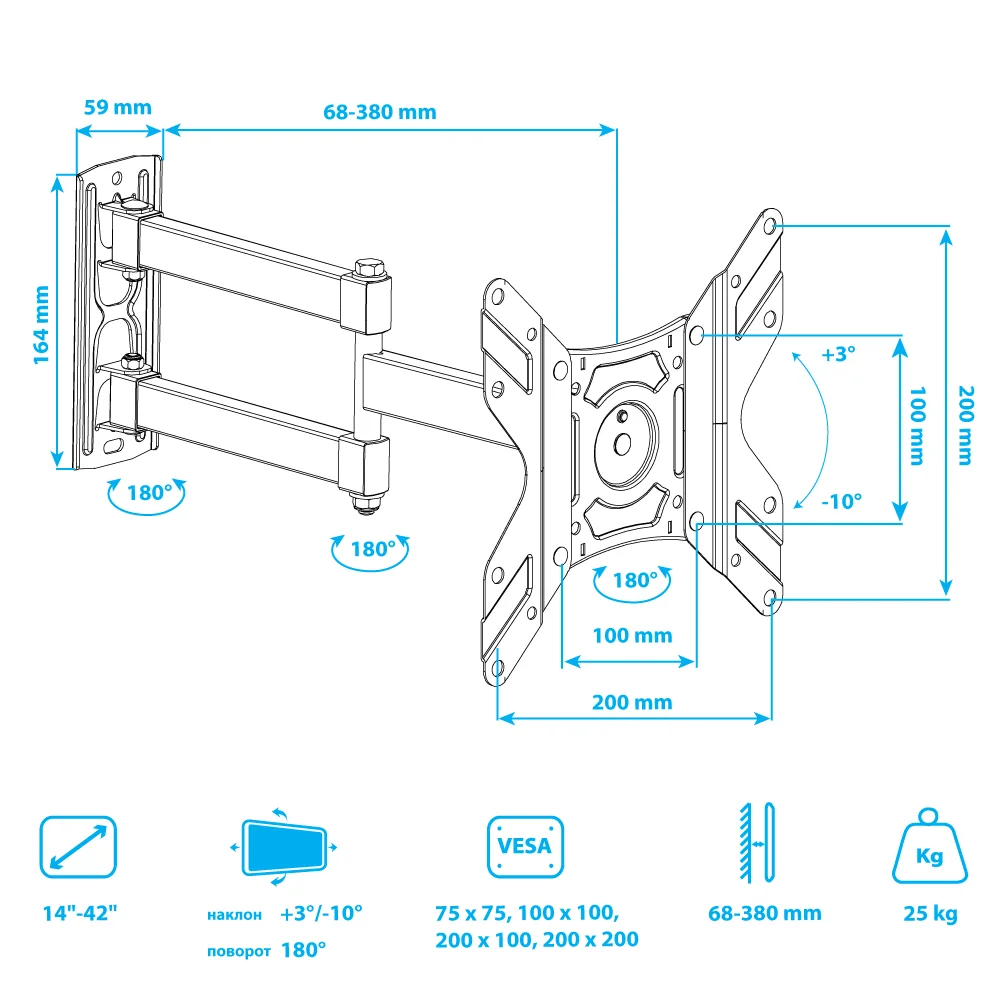 ARM MEDIA LCD-205 BLACK BLACK надёжно удержит экран размером 14"-42" дюйма и весом 25 кг. Простая конструкция ARM MEDIA LCD-205 BLACK BLACK идеально подойдет для самостоятельного монтажа. Наклонно-поворотная регулировка позволит наклонять вверх и вниз на +3 -10°, поворачивать влево и вправо на 180°, и выдвигать на 68-380 мм.
