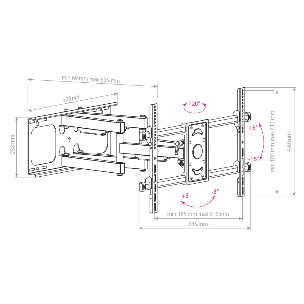 ARM MEDIA PARAMOUNT-70 BLACK надёжно удержит экран размером 32"-90" дюйма и весом 65 кг. Простая конструкция ARM MEDIA PARAMOUNT-70 BLACK идеально подойдет для самостоятельного монтажа. Наклонно-поворотная регулировка позволит наклонять вверх и вниз на +5 -15°, поворачивать влево и вправо на 120°, и выдвигать на 69-635 мм.