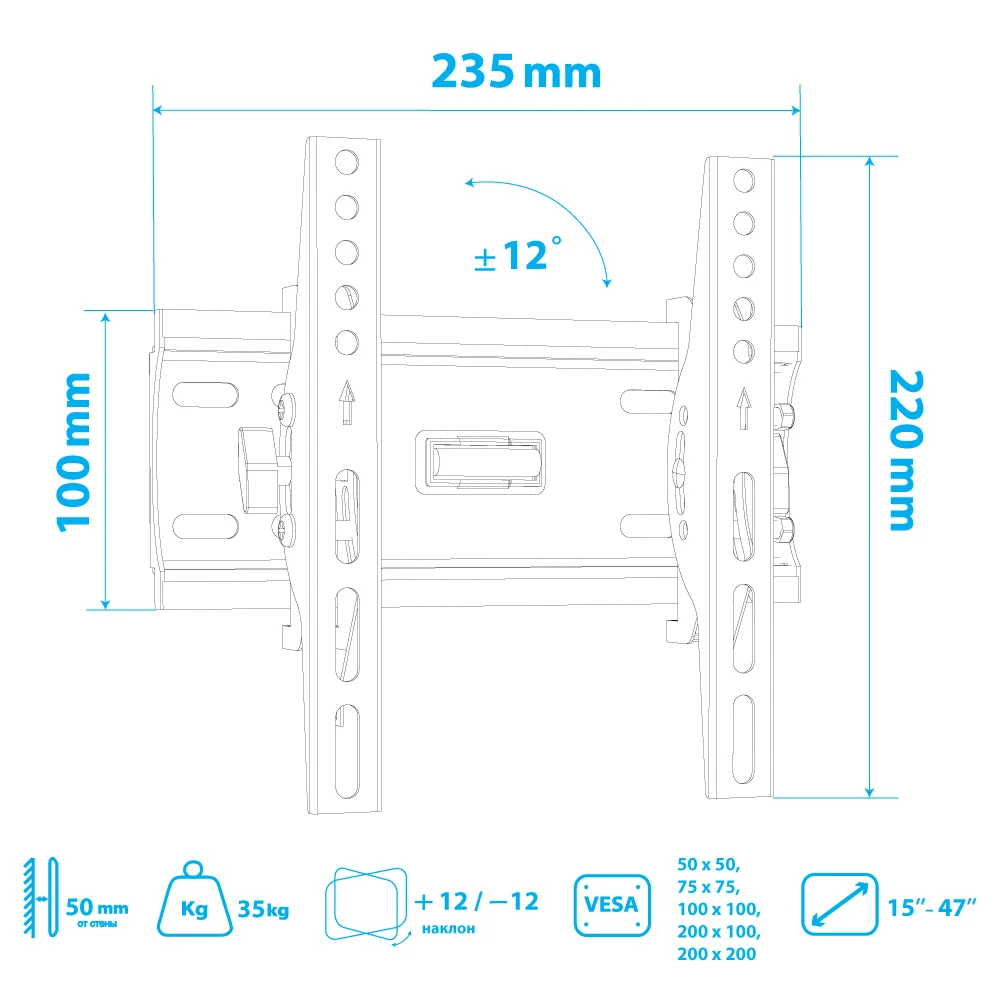 | Дополнительно | Надежная стальная конструкция, Универсальная система крепления для любого телевизора с посадочными отверстиями от 50 до 210 мм по горизонтали и от 50 до 200 мм по вертикали, Простая установка при помощи водяного уровня, Минимальное расстояние до стены 50 мм, Крепление направляющей с «двойным крючком» |