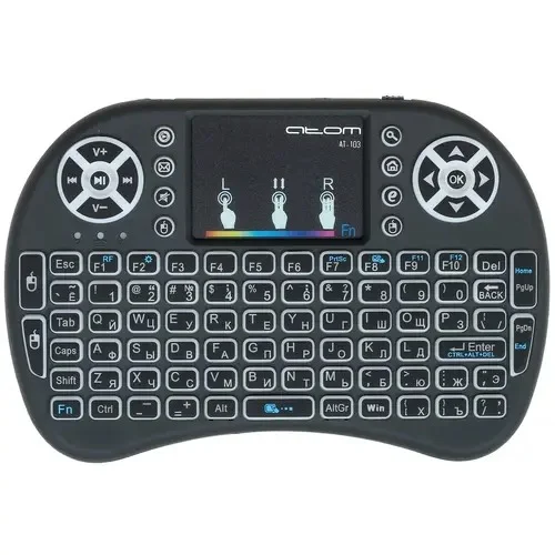 Клавиатура для ТВ Атом АТ-103 оснащена и русской, и английской раскладками. Клавиатура дополнена подсветкой с возможностью выбора цвета (красный, зеленый, синий). Питание модель получает от встроенного аккумулятора с возможностью подзарядки. Отличительные особенности модели – сверхкомпактные размеры (14.6x9.7 см) и нестандартная форма, напоминающая игровой джойстик.