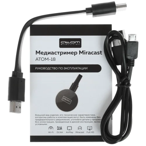 Miracast медиаплеер АТОМ 18 обеспечивает возможность трансляции мультимедийного контента с мобильных устройств на телевизор. Используемый для подключения к телевизору интерфейс – HDMI. Медиаплеер обладает поддержкой DLNA, Netflix, AirPlay, Youtube, Flickr и сервиса погоды. Модель совместима с устройствами под управлением Windows, OS X, iOS и Android.