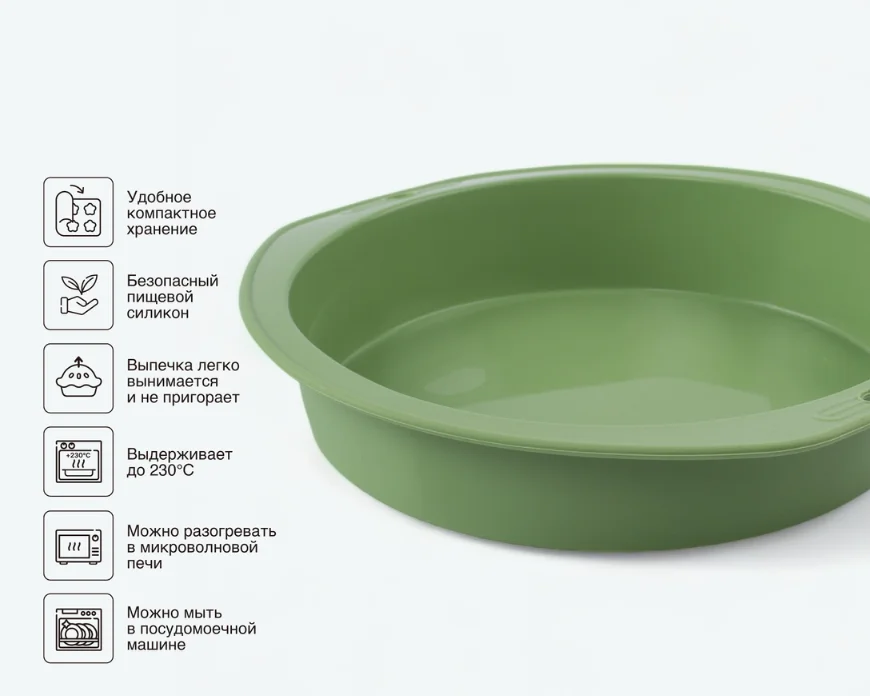 Форма для пирога силиконовая OLIVE 25.5х27.5см нежного оливкового цвета идеально подходит для песочных, сливочных и фруктовых пирогов, а также для запеканок и других блюд. Ее антипригарные свойства обеспечивают идеальное извлечение даже самых нежных бисквитов, а устойчивость к различным температурам позволяет использовать форму для создания холодных десертов.