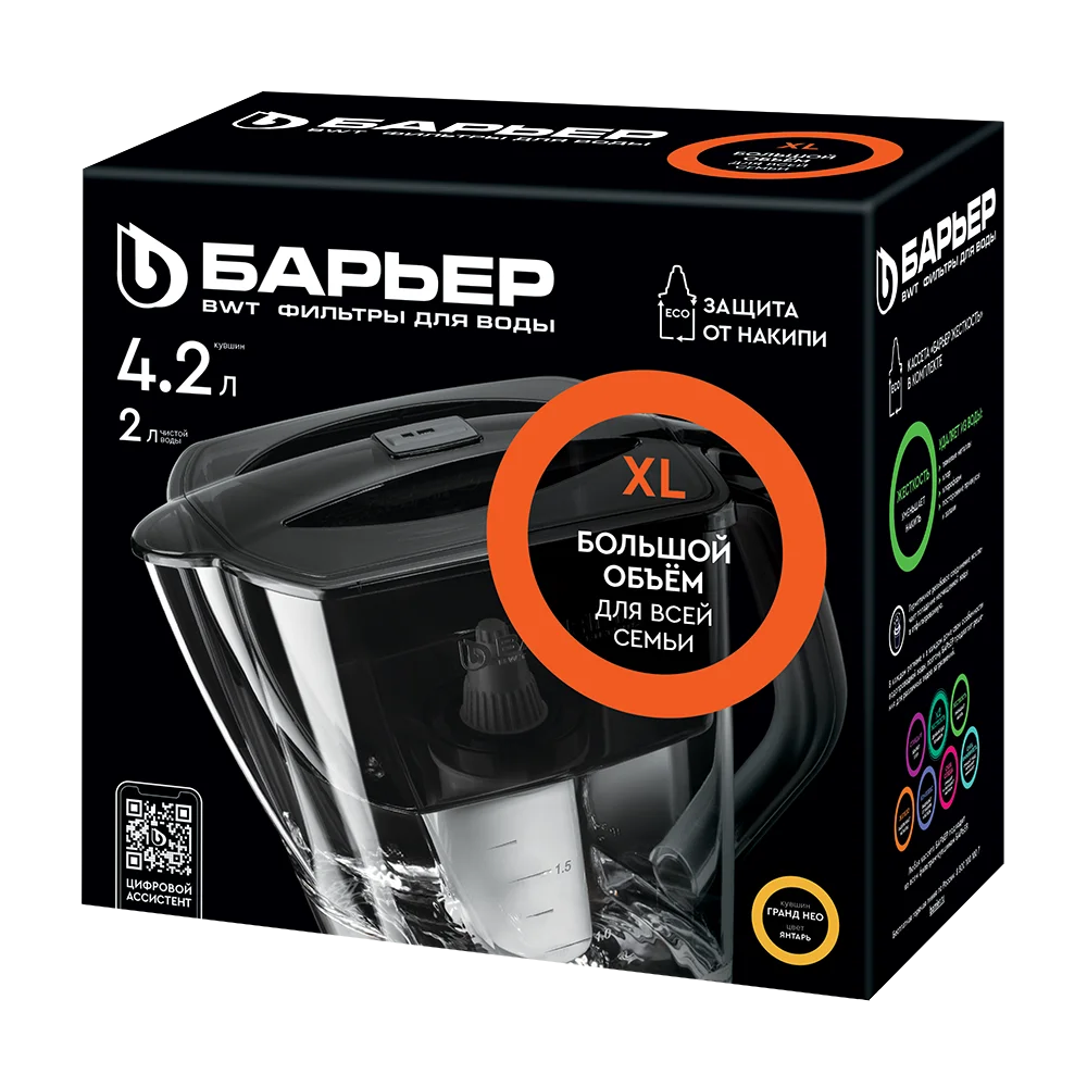 В комплекте с кувшином кассета "БАРЬЕР Жесткость" для вкусной воды без накипи. Кассета умягчает воду, защищает от хлора, тяжелых металлов и других вредных примесей.