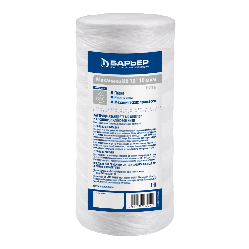 Картридж БАРЬЕР «Механика 10 мкм нить» задерживает механические примеси размером до 10 мкм (песок, ржавчину и другие механические примеси).