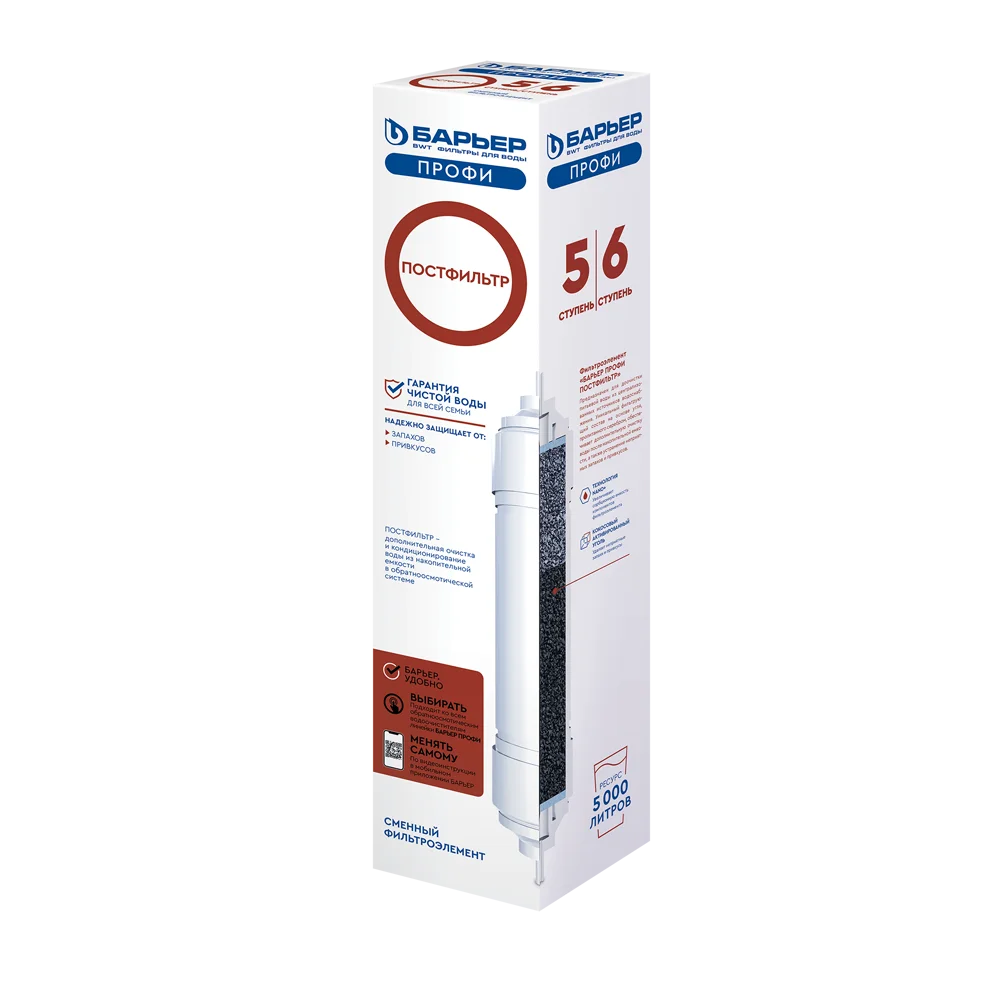 БАРЬЕР ПРОФИ ОСМО ПостФильтр – картридж финишной очистки для систем обратного осмоса БАРЬЕР ПРОФИ Осмо 100, БАРЬЕР ПРОФИ Осмо 100 М, БАРЬЕР ПРОФИ Осмо 100 Boost, ПРОФИ Осмо 100 Boost М. В системах без минерализатора используется в качестве пятой ступени, в комплектации с минерализатором становится шестой ступенью. Картридж устраняет специфические запахи и привкусы, обеспечивает кондиционирование воды после накопительной емкости.