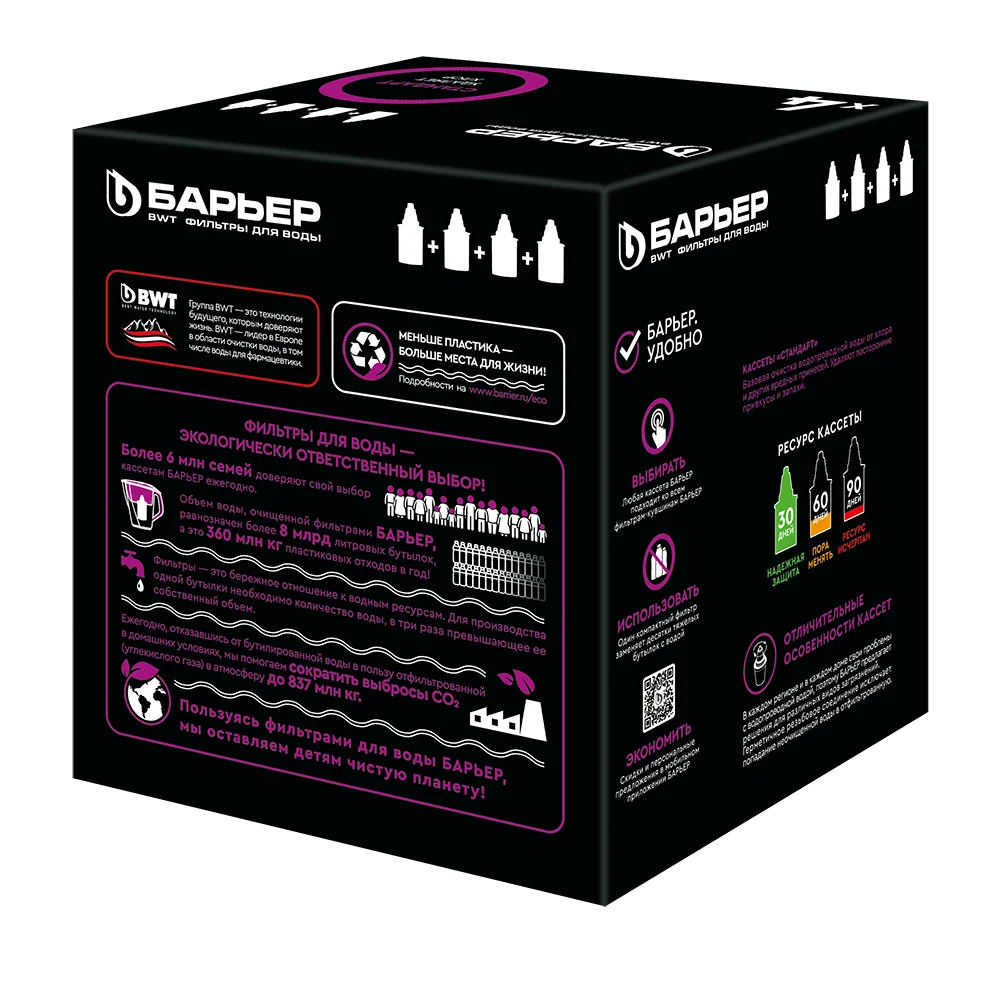 В упаковке находится 4 (четыре) кассеты БАРЬЕР Стандарт, все кассеты БАРЬЕР подходят ко всем кувшинам БАРЬЕР. Одна кассета БАРЬЕР способна заменить несколько сотен пластиковых бутылок. По окончании ресурса кассеты можно сдать на переработку.