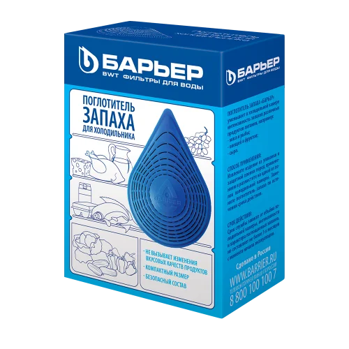 Поглотитель запаха для холодильника с фильтром из активированного угля. Удаляет из холодильной камеры сильные запахи, например копченостей. Срок службы фильтрующего элемента зависит от объема холодильника и других условий.