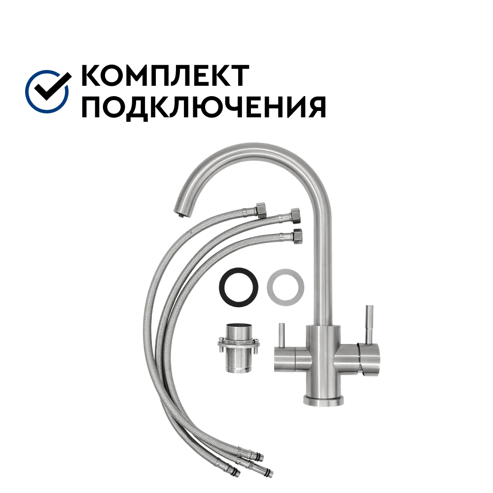 Удобный смеситель из нержавеющей стали экономит пространство на кухне за счет возможности подачи водопроводной и очищенной воды в одном кране.