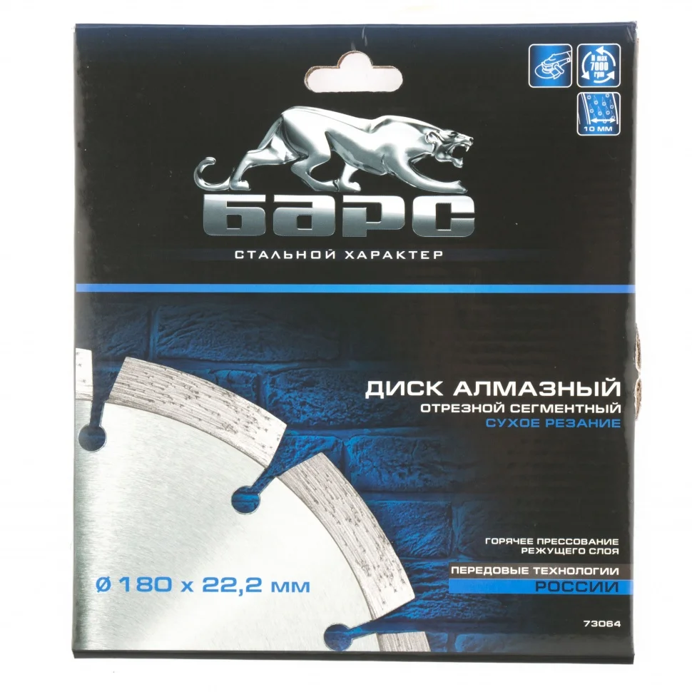 Сегментный алмазный диск Барс ф180х22,2 мм 73064 для сухого резания устанавливается в качестве оснастки на УШМ и штроборезы с соответствующим посадочным диаметром. Он пригодится домашним мастерам и профессионалам для сухой резки камня, кирпича, бетона и гранита, позволит быстро справиться с большим объемом работ.ПреимуществаКонструкция с 14 прорезями позволяет каждому сектору диска немного менять форму при нагреве в процессе реза и сохранять высокую работоспособность.Сегментная форма делает одинаково эффективной резку разных материалов, при этом прибегать к водяному охлаждению нет необходимости.Качественные алмазы, их высокая концентрация и широкая режущая часть (10 мм) обеспечивают эффективный рез.Оптимально подобранная связка гарантирует эффективность работы и высокий ресурс диска.Горячее прессование режущего слоя обеспечивает точную форму и надежность диска, позволяет использовать его для интенсивных работ.Стальной корпус хорошо пружинит, т.к. имеет в составе марганец, а это значит, что риск деформации диска исключен.В качестве защитно-декоративного покрытия корпуса использована краска с антикоррозионными свойствами.