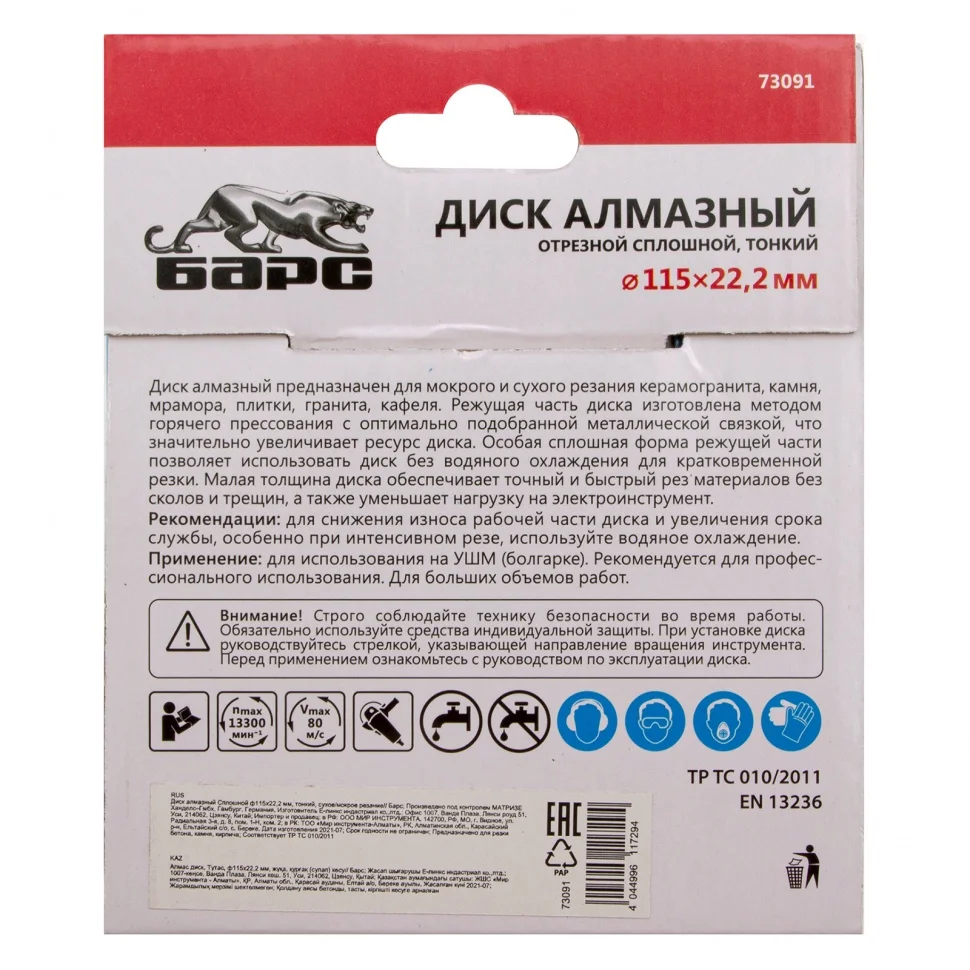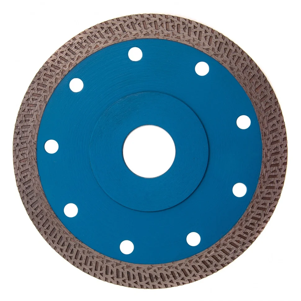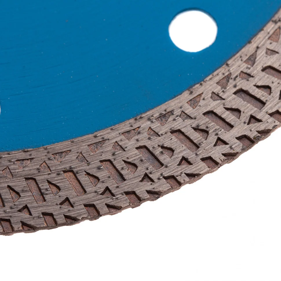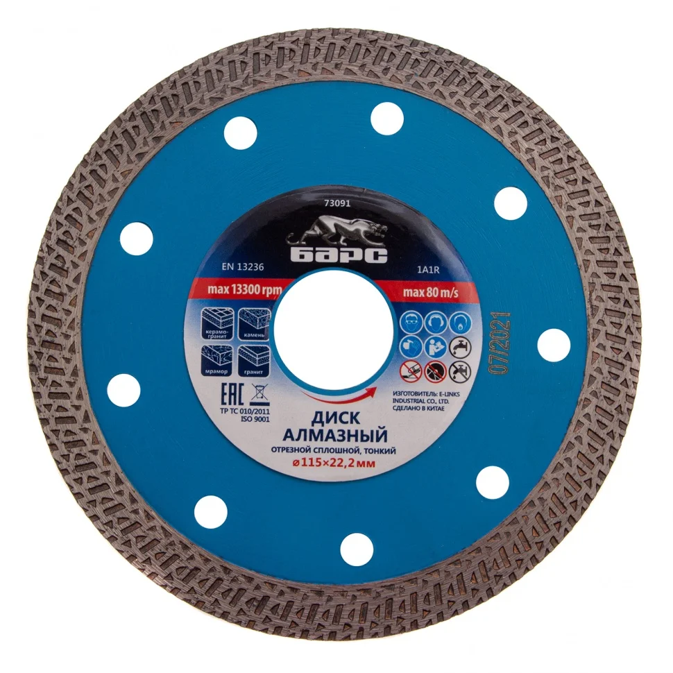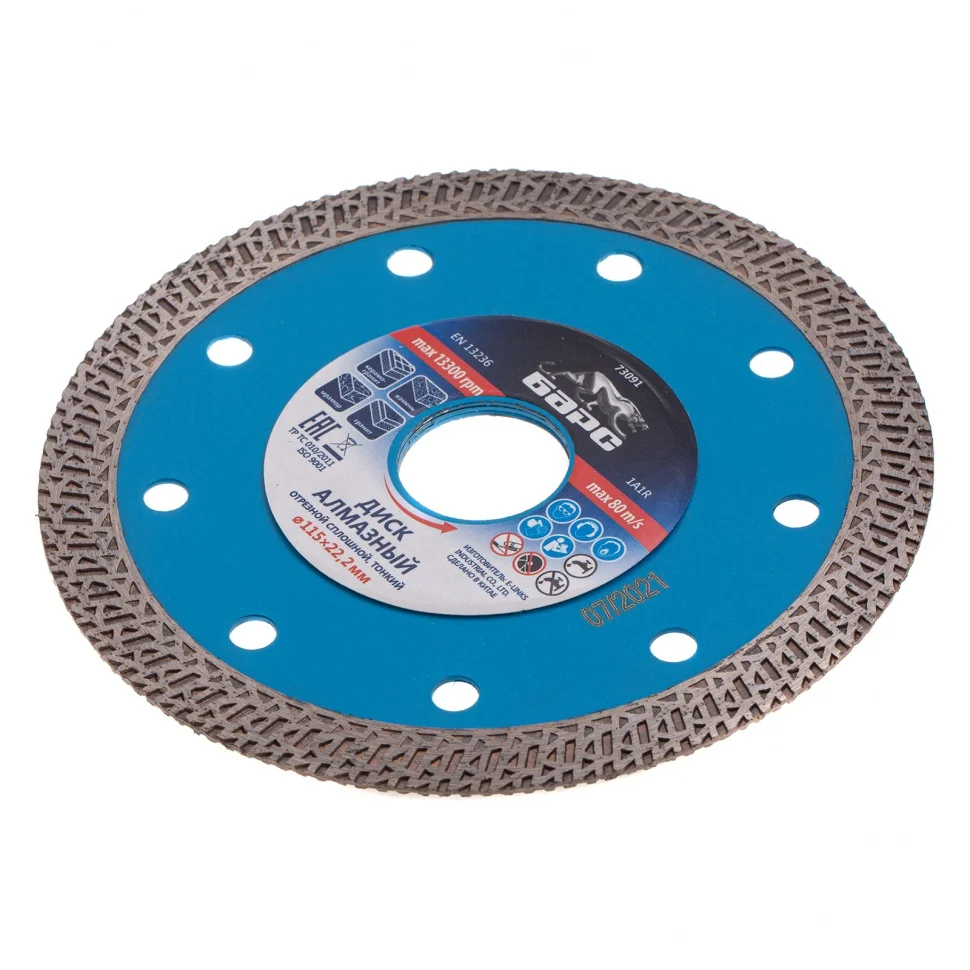Тонкий сплошной алмазный диск Барс ф115х22,2 мм 73091 с особой формой рабочей части применяется как для сухого, так и мокрого резания гранита и керамогранита, плитки, кафеля, мрамора, искусственного и натурального камня с помощью УШМ или плиткореза. Уменьшенная толщина диска позволяет снизить нагрузку на рабочий инструмент при резке керамогранита и других твердых материалов. Диск предназначен для профессиональной эксплуатации. Использование водяного охлаждения увеличивает ресурс диска и снижает вероятность получения сколов.ПреимуществаСплошная конструкция с перфорацией гарантирует быстрый качественный рез без сколов.В состав специально подобранной под тип диска связки включены тугоплавкие соединения металлов, поэтому диск выдерживает даже высокие температуры.Режущая кромка шириной 10 мм с высокой концентрацией алмазов повышает скорость и производительность работы.Зона рядом с посадочным отверстием дополнена специальными накладками, что увеличивает прочность всей конструкции.Сетчатый орнамент позволяет снизить трение при работе, таким образом диск охлаждается быстрее.Диск отличается надежностью и обладает высоким ресурсом, т.к. изготовлен по технологии горячего прессования.