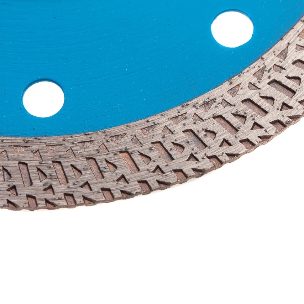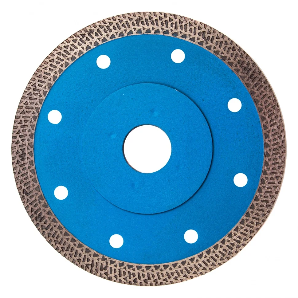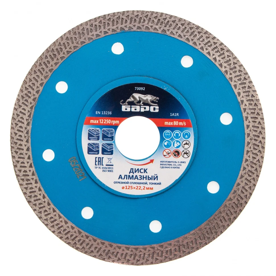 Тонкий сплошной алмазный диск Барс ф125х22,2 мм 73092 с особой формой рабочей части применяется как для сухого, так и мокрого резания гранита и керамогранита, плитки, кафеля, мрамора, искусственного и натурального камня с помощью УШМ или плиткореза. Уменьшенная толщина диска позволяет снизить нагрузку на рабочий инструмент при резке керамогранита и других твердых материалов. Диск предназначен для профессиональной эксплуатации. Использование водяного охлаждения увеличивает ресурс диска и снижает вероятность получения сколов.ПреимуществаСплошная конструкция с перфорацией гарантирует быстрый качественный рез без сколов.В состав специально подобранной под тип диска связки включены тугоплавкие соединения металлов, поэтому диск выдерживает даже высокие температуры.Режущая кромка шириной 10 мм с высокой концентрацией алмазов повышает скорость и производительность работы.Зона рядом с посадочным отверстием дополнена специальными накладками, что увеличивает прочность всей конструкции.Сетчатый орнамент позволяет снизить трение при работе, таким образом диск охлаждается быстрее.Диск отличается надежностью и обладает высоким ресурсом, т.к. изготовлен по технологии горячего прессования.