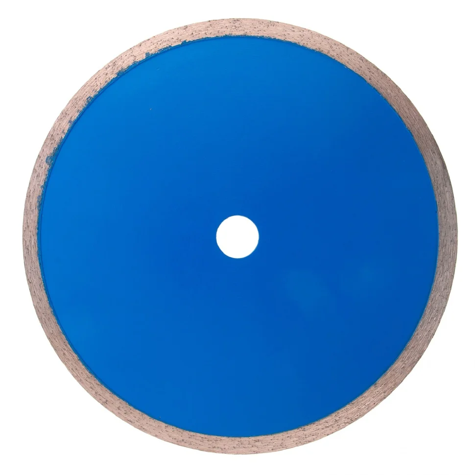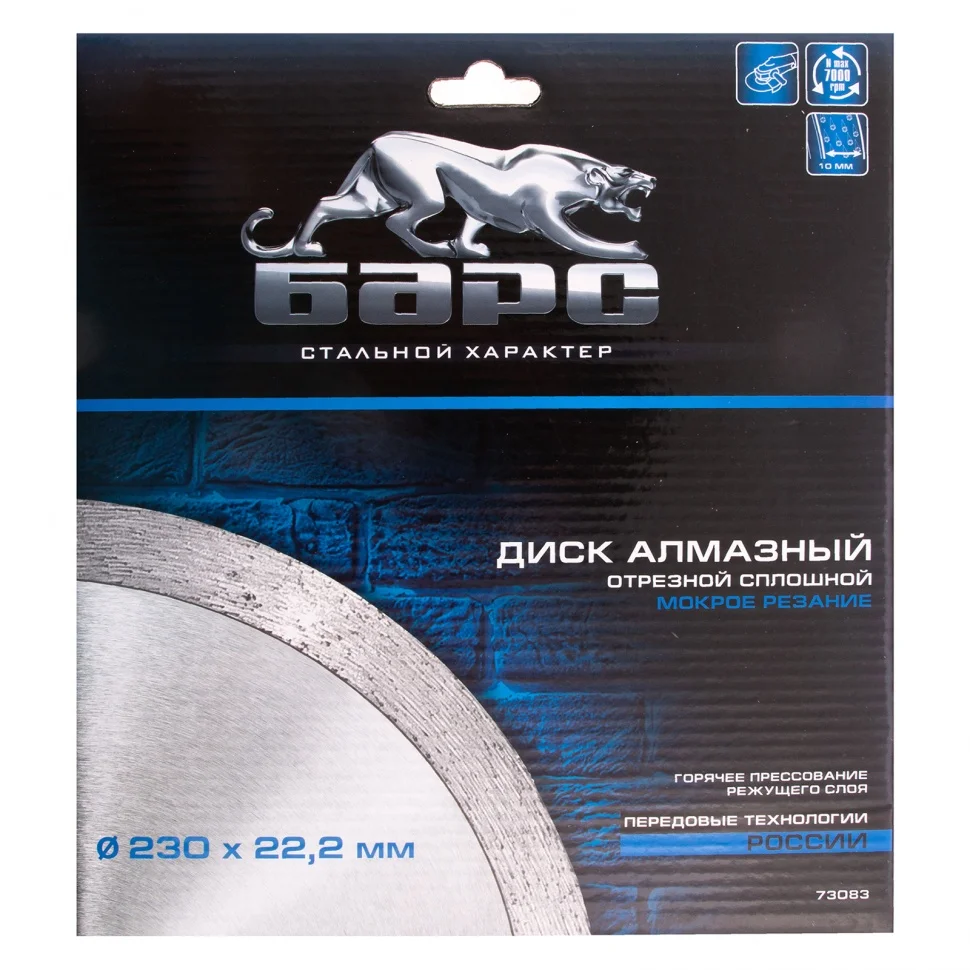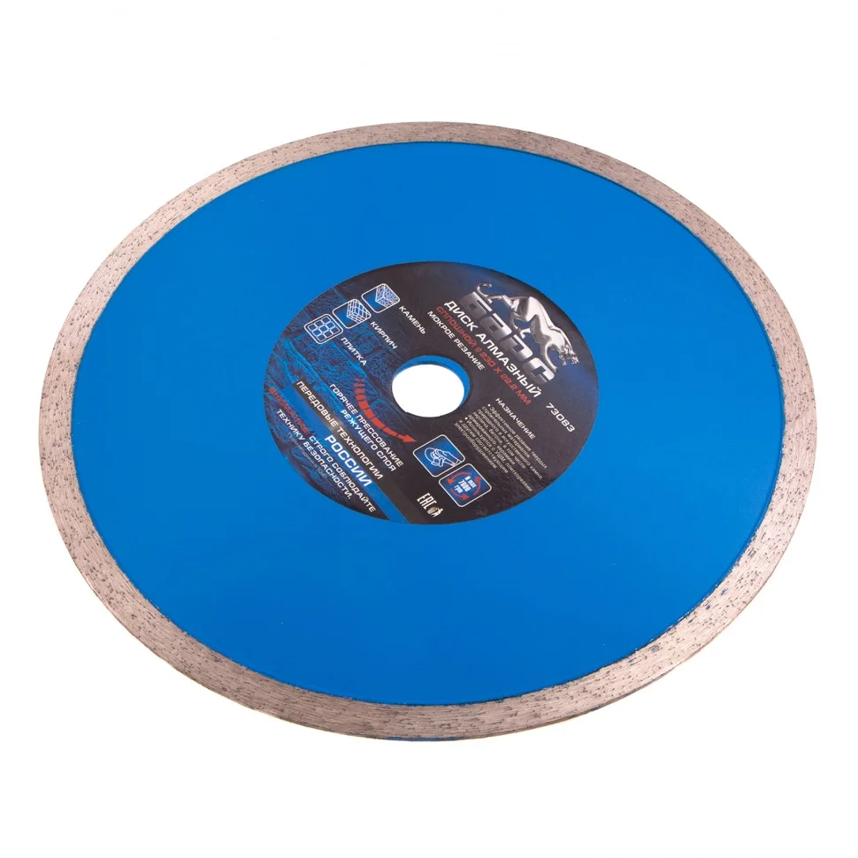 Сплошной алмазный диск Барс ф230х22,2 мм 73083 применяется совместно с УШМ или плиткорезами для мокрого резания твердых материалов: гранит и керамогранит, кафель, плитка, мрамор, натуральный и искусственный камень. Сплошная форма диска позволяет добиться ровного среза без трещин и сколов. Водяное охлаждение предотвращает перегрев диска, а также повышает его ресурс.ПреимуществаРежущая часть шириной 10 мм с высокой концентрацией алмазных зерен обеспечивает эффективную быструю работу и возможность профессионального применения.Рабочая часть включает в себя только высококачественные синтетические алмазы повышенной прочности, поэтому диск долго сохраняет режущие свойства.Оптимально сбалансированная металлическая связка позволяет проводить рез различных материалов.При изготовлении диска используется технология горячего прессования, поэтому он обладает высоким ресурсом и обеспечивает стабильный рез.Стальной корпус увеличенной толщины позволяет диску выдерживать высокие нагрузки без риска деформации.
