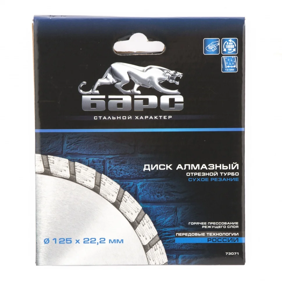 Алмазный диск Барс Турбо ф125х22,2 мм 73071 предназначен для сухого резания бетона, в т.ч. свежего, среднеармированного железобетона, камня, кирпича, гранита и песчаника. Его можно использовать с УШМ с посадочным диаметром 22,2 мм при проведении строительных и ремонтных работ.ПреимуществаДиск обеспечивает высокую производительность работ и может использоваться профессионально за счет ширины режущего слоя 10 мм и высокой концентрации алмазов.Турбированная форма и перфорация диска гарантируют быстрое сухое резание различных материалов без необходимости использования водяного охлаждения.Оптимальный баланс компонентов в металлической связке увеличивает рабочий ресурс диска - алмазы равномерно изнашиваются и вскрытие на кромке новых зерен происходит своевременно.Корпус из стали 65Mn сохраняет эксплуатационные качества диска, т.к. не дает ему искривляться даже при интенсивном использовании.Защитная краска предотвращает образование коррозии на корпусе диска.Диск можно использовать для большого объема работ, т.к. при его изготовлении используется метод горячего прессования, значительно повышающий ресурс.
