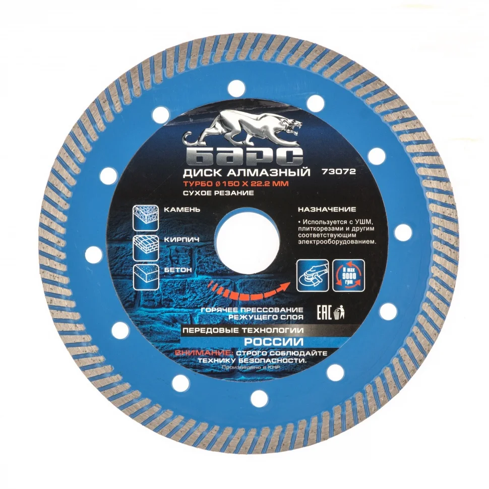 Алмазный диск Барс Турбо ф150х22,2 мм 73072 предназначен для сухого резания бетона, в т.ч. свежего, среднеармированного железобетона, камня, кирпича, гранита и песчаника. Его можно использовать с УШМ с посадочным диаметром 22,2 мм при проведении строительных и ремонтных работ.ПреимуществаДиск обеспечивает высокую производительность работ и может использоваться профессионально за счет ширины режущего слоя 10 мм и высокой концентрации алмазов.Турбированная форма и перфорация диска гарантируют быстрое сухое резание различных материалов без необходимости использования водяного охлаждения.Оптимальный баланс компонентов в металлической связке увеличивает рабочий ресурс диска - алмазы равномерно изнашиваются и вскрытие на кромке новых зерен происходит своевременно.Корпус из стали 65Mn сохраняет эксплуатационные качества диска, т.к. не дает ему искривляться даже при интенсивном использовании.Защитная краска предотвращает образование коррозии на корпусе диска.Диск можно использовать для большого объема работ, т.к. при его изготовлении используется метод горячего прессования, значительно повышающий ресурс.