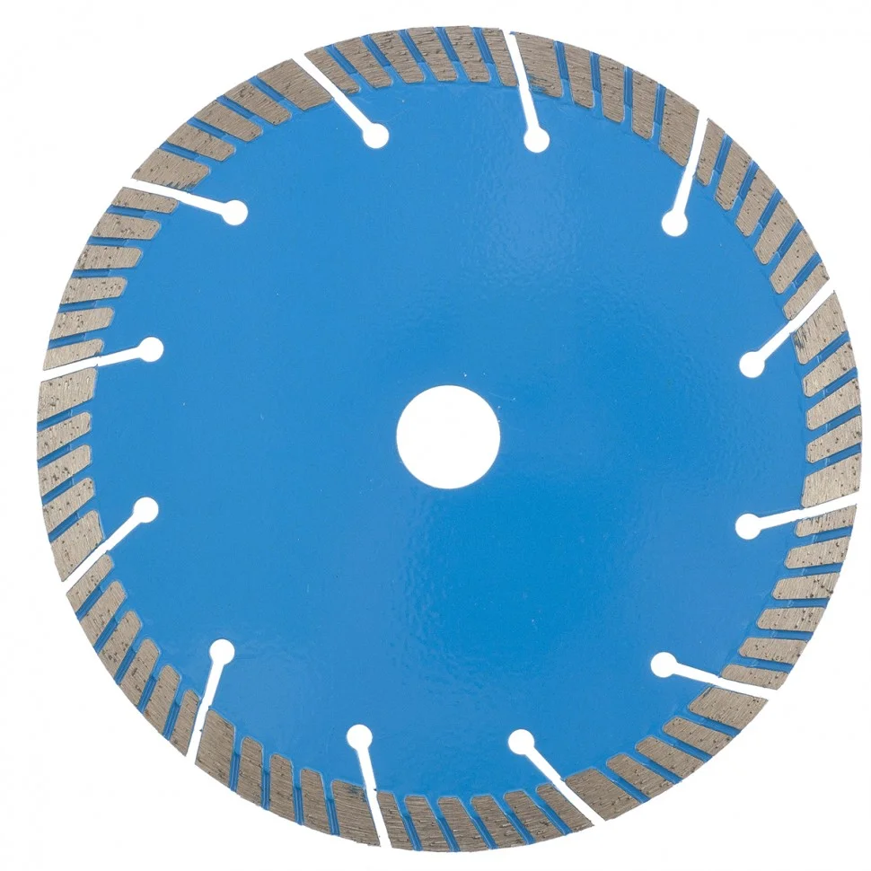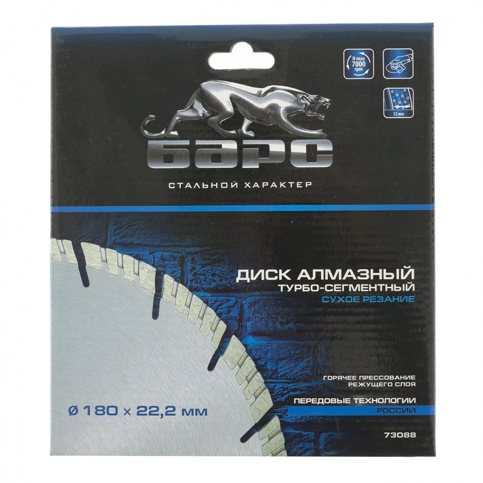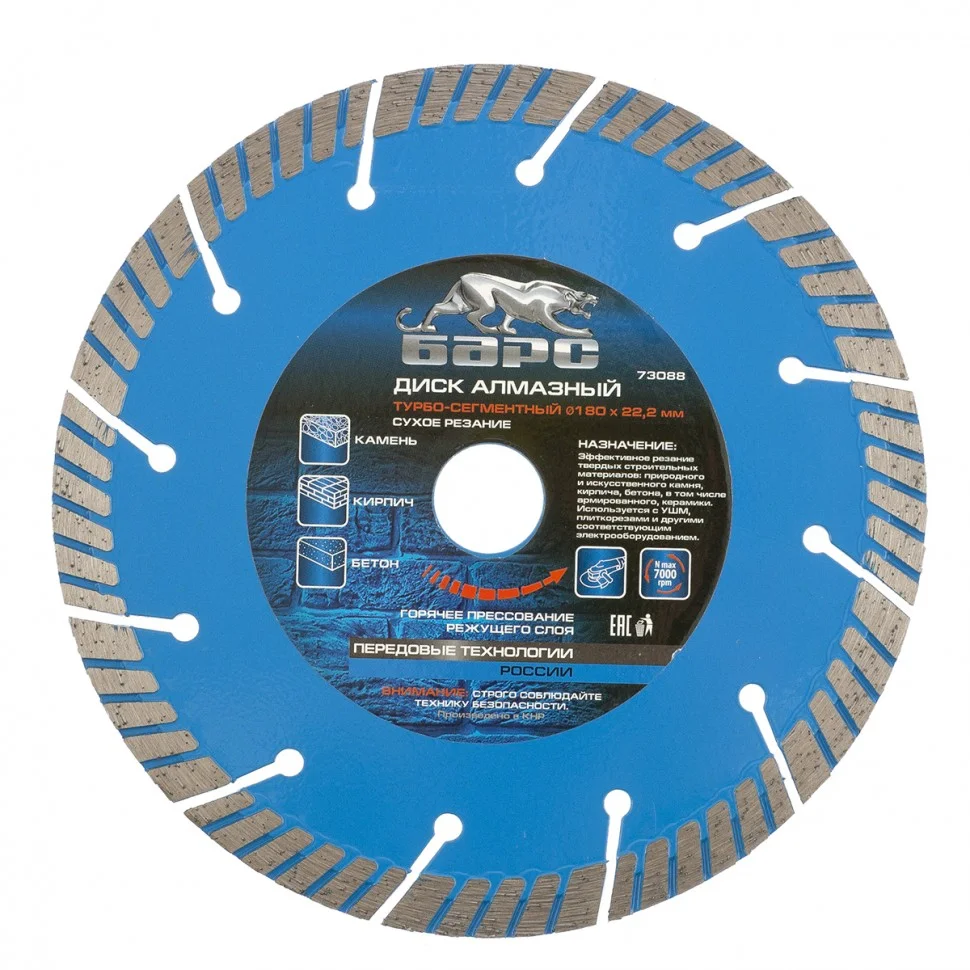 Турбо-сегментный алмазный диск Барс ф180х22,2 мм 73088 позволяет проводить сухое резание твердых материалов: камня, песчаника, кирпича, гранита, бетона, в т.ч. свежего и среднеармированного. Применяется в качестве расходного материала с УШМ. За счет турбо-сегментной конструкции диск быстро справляется с поставленными задачами и не требует водяного охлаждения.ПреимуществаТурбированные рабочие кромки - диск быстро охлаждается, риск его повреждения минимизируется даже при интенсивных нагрузках.Высокий ресурс - ширина режущего слоя увеличена до 12 мм, в ее составе только высококачественные синтетические алмазы.Прорези заужены и расположены под углом - при соприкосновении с арматурой исключается потеря алмазного слоя и поломка диска.Качественная связка - она повышает теплостойкость диска, позволяя работать с высокой скоростью.Высокая концентрация алмазов - диск подходит для выполнения большого объема работ, в том числе для профессиональной эксплуатации.Горячее прессование - такая технология производства значительно повышает надежность диска.Корпус диска из инструментальной стали 65Mn - высокая прочность и упругие свойства предотвращают искривлению диска при быстром резании материалов.Антикоррозионная защита - корпус покрыт краской.