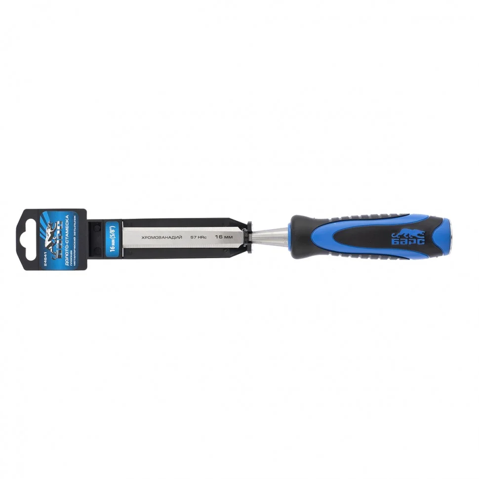 Плоское долото-стамеска Барс 24641 с шириной режущей части 16 мм, с двухкомпонентной рукояткой и металлическим затыльником, предназначено для выборки прямоугольных пазов, снятия фасок, обработки шиповых соединений и выполнения других столярно-плотницких работ. Используется для работы с массивом дерева любой твердости. По затыльнику рукоятки можно наносить удары киянкой или небольшим молотком, поэтому инструмент легко погружается в древесину и обеспечивает аккуратный ровный контур среза.ПреимуществаПрочность — полотно из легированной хромованадиевой стали 40ХФА выдерживает динамические нагрузки.Высокий ресурс — полотно на 2/3 длины рабочей части закалено до твердости 57-62 HRC и заточено под углом 20-35 градусов, повторная заточка требуется не чаще 1-2 раз в год.Крепкая рукоятка — металлический затыльник предотвращает деформацию стамески от удара молотком или киянкой.Комфортная работа — двухкомпонентная обрезиненная рукоятка с рельефными элементами не выскальзывает из ладони.