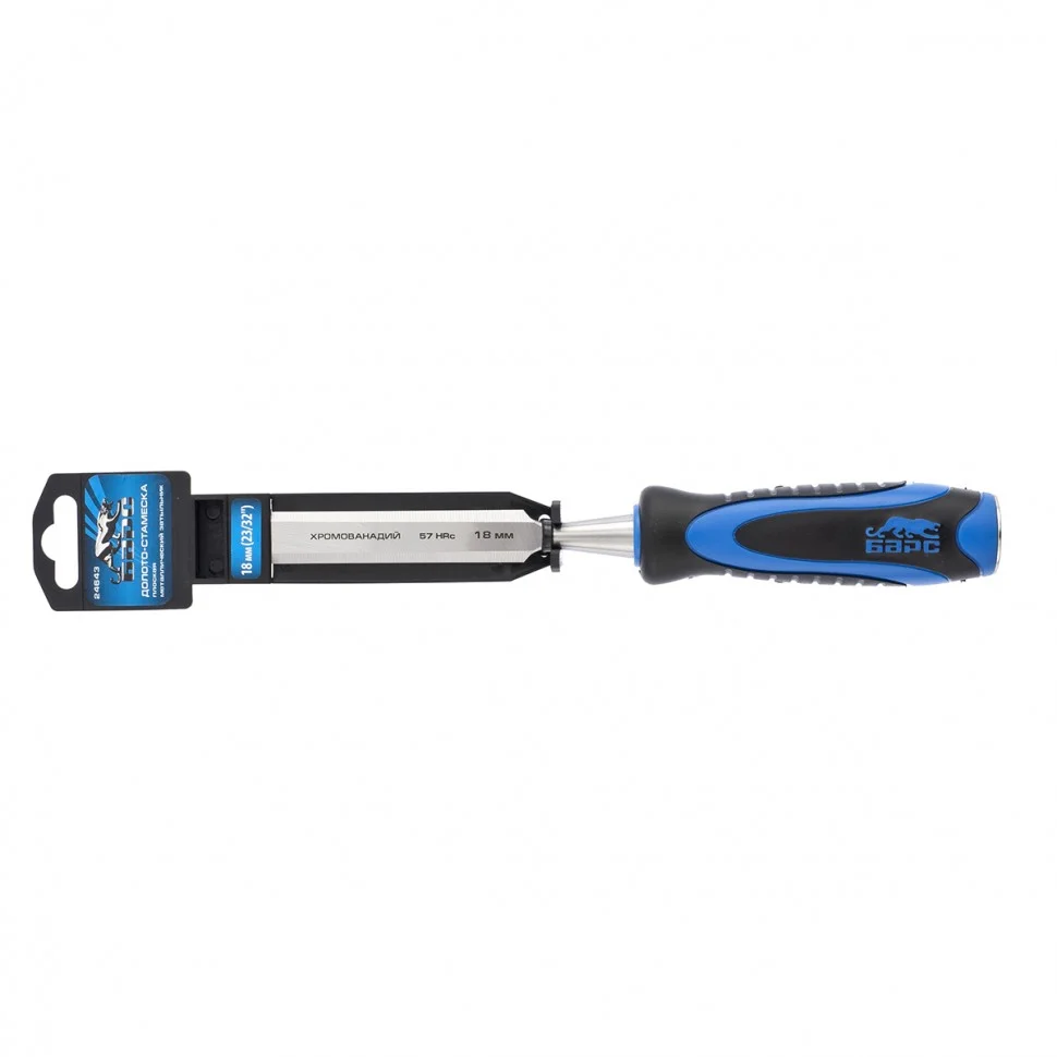 Плоское долото-стамеска Барс 24643 с шириной режущей части 18 мм, с двухкомпонентной рукояткой и металлическим затыльником, предназначено для выборки прямоугольных пазов, снятия фасок, обработки шиповых соединений и выполнения других столярно-плотницких работ. Используется для работы с массивом дерева любой твердости. По затыльнику рукоятки можно наносить удары киянкой или небольшим молотком, поэтому инструмент легко погружается в древесину и обеспечивает аккуратный ровный контур среза.ПреимуществаПрочность — полотно из легированной хромованадиевой стали 40ХФА выдерживает динамические нагрузки.Высокий ресурс — полотно на 2/3 длины рабочей части закалено до твердости 57-62 HRC и заточено под углом 20-35 градусов, повторная заточка требуется не чаще 1-2 раз в год.Крепкая рукоятка — металлический затыльник предотвращает деформацию стамески от удара молотком или киянкой.Комфортная работа — двухкомпонентная обрезиненная рукоятка с рельефными элементами не выскальзывает из ладони.
