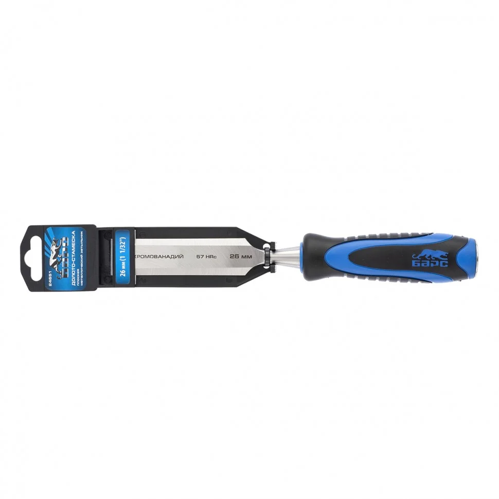 Плоское долото-стамеска Барс 24651 с шириной режущей части 26 мм, с двухкомпонентной рукояткой и металлическим затыльником, предназначено для выборки прямоугольных пазов, снятия фасок, обработки шиповых соединений и выполнения других столярно-плотницких работ. Используется для работы с массивом дерева любой твердости. По затыльнику рукоятки можно наносить удары киянкой или небольшим молотком, поэтому инструмент легко погружается в древесину и обеспечивает аккуратный ровный контур среза.ПреимуществаПрочность — полотно из легированной хромованадиевой стали 40ХФА выдерживает динамические нагрузки.Высокий ресурс — полотно на 2/3 длины рабочей части закалено до твердости 57-62 HRC и заточено под углом 20-35 градусов, повторная заточка требуется не чаще 1-2 раз в год.Крепкая рукоятка — металлический затыльник предотвращает деформацию стамески от удара молотком или киянкой.Комфортная работа — двухкомпонентная обрезиненная рукоятка с рельефными элементами не выскальзывает из ладони.