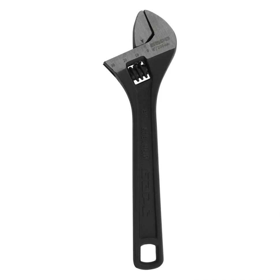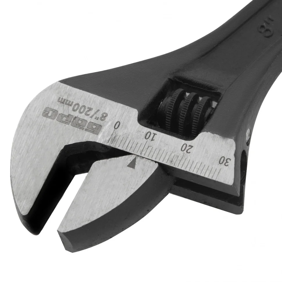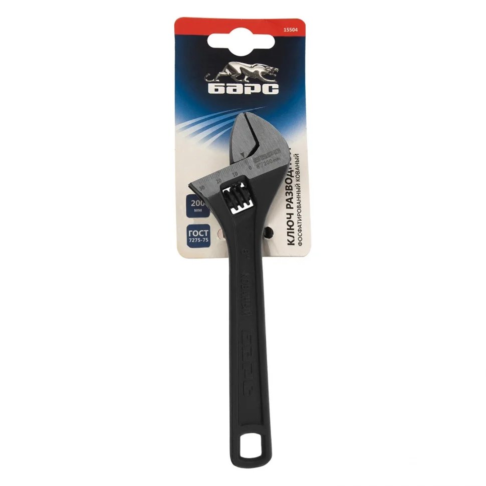 Разводной ключ Барс 15504, 200 мм, заменяет собой целый комплект обычных гаечных ключей. Он используется для монтажа и демонтажа крепежных элементов. Губки можно разводить на точно заданное расстояние, что позволяет подкручивать детали различного размера. Разводной ключ пригодится при проведении слесарных, сантехнических, ремонтных работ.ПреимуществаКлюч обладает высокой прочностью благодаря усиленной конструкции и качественному материалу изготовления — хромованадиевой стали, подвергнутой закалке.Фосфатное покрытие червячного винтового механизма придает ему устойчивость к образованию коррозии и износу.Мерная шкала на губке повышает точность проводимых работ.Обливная рукоятка с отверстием для подвесного хранения надежно и удобно ложится в руку.
