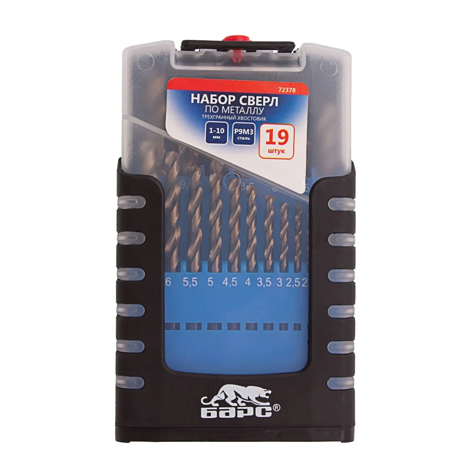 Набор Барс 72378 включает 19 сверл по металлу диаметром 1-10 мм (через 0,5 мм), из стали P6M5, с многогранной заточкой, в боксе, и используется для сверления отверстий в металлических заготовках. Оснастки изготовлены методом шлифовки, что обеспечивает высокую точность работ. Набор будет полезен во время слесарных работ, пригодится также дома, на даче или в гараже.ПреимуществаВысококачественная быстрорежущая сталь — легирование вольфрамом и молибденом увеличивает стойкость оснасток к перегреву и динамическим нагрузкам.Твердость 59-62 HRC — сверла долго держат заточку, что обеспечивает им высокий ресурс.Многогранная заточка — сверла легко засверливаются, образование заусенцев сведено к минимуму.Трехгранный хвостовик — сверла надежно фиксируются в патроне и не проворачиваются.Пластиковый бокс — набор удобен в хранении и транспортировке.
